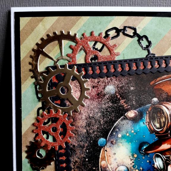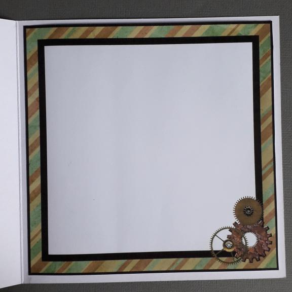 The insert has a square frame of the green striped paper with cogs in the bottom right corner,