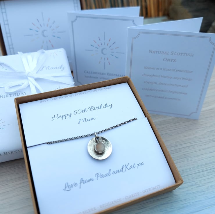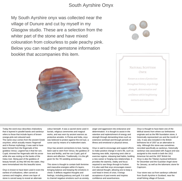 You can read the booklet that comes with my South Ayrshire onyx designs in the images, or you can find this design with other Scottish stones in the Caledonian Keepsakes shop.