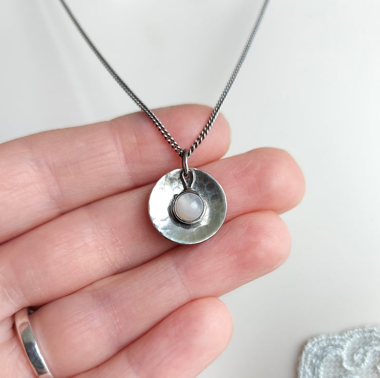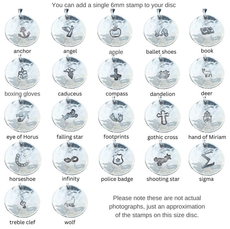 This larger version of my domed disc pendant can be personalised with any one of my 6mm stamps, perfect to commemorate your special occasion, or as an emblem for good luck. You can also add a 3mm stamp or two 1.5mm stamps to your setting or chain tag and even add a personal message to the inside of your box.