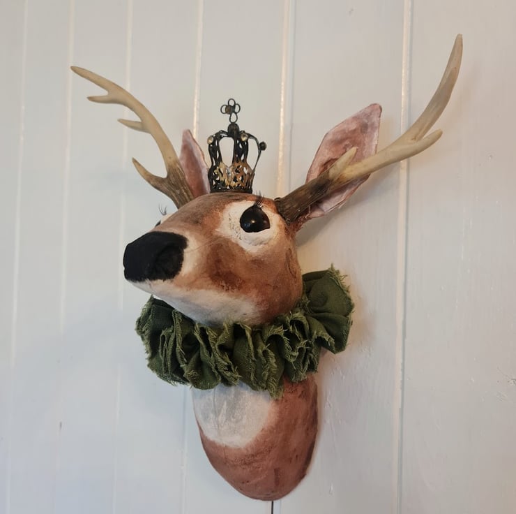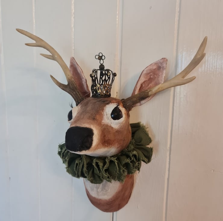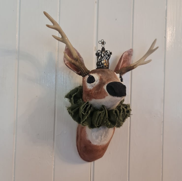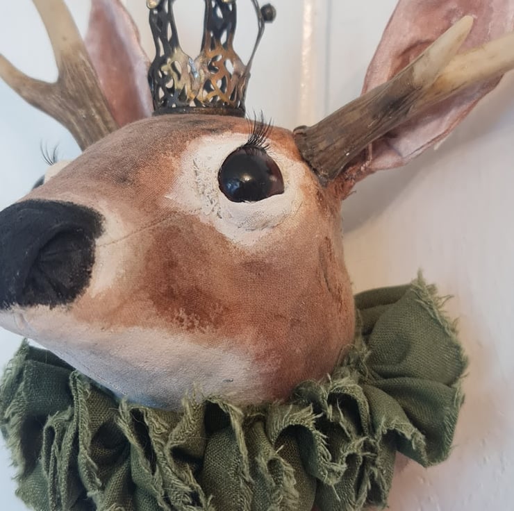 This orginal quirky, faux taxidermy mini king of the stags is hand and machine stitiched in unbleached cotton, as well as hand painted.