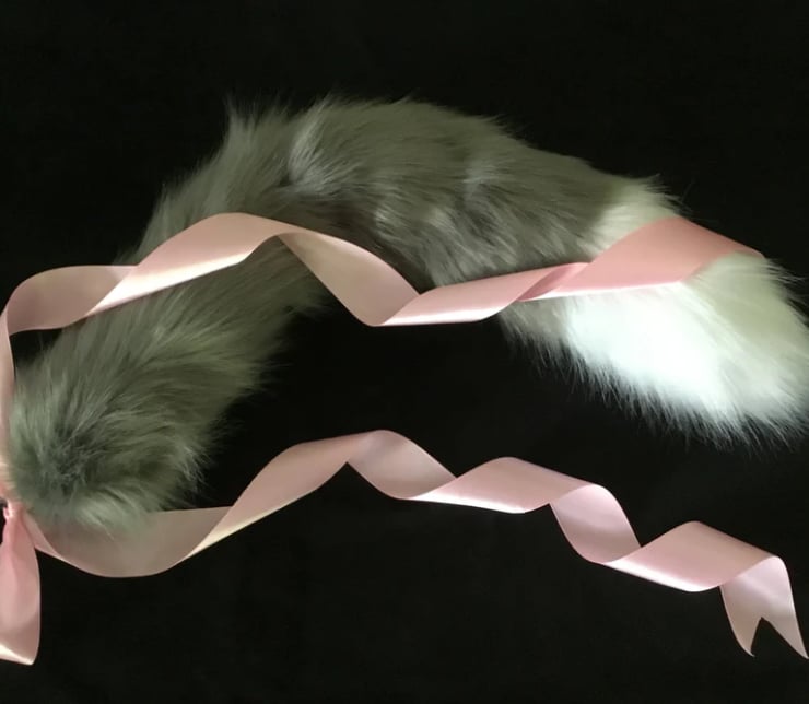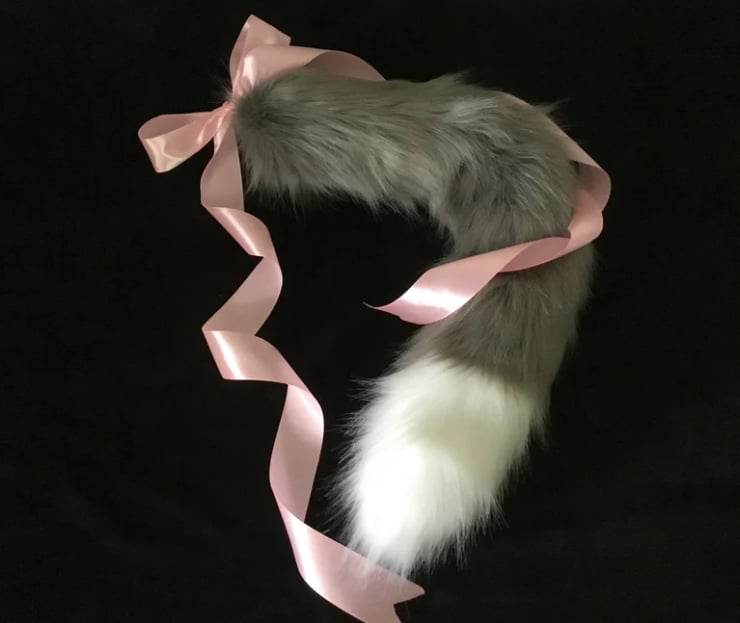A Gorgeous 25 inch silver grey kitten tail, with a white tip, finished with a baby pink ribbon, that is lightly filled for the perfect movement.