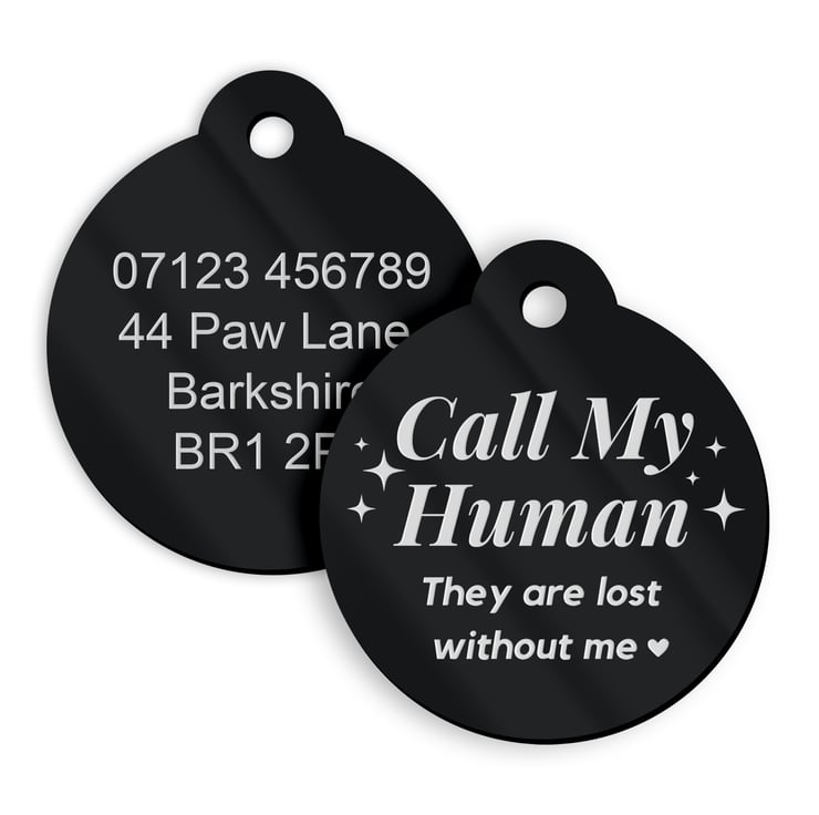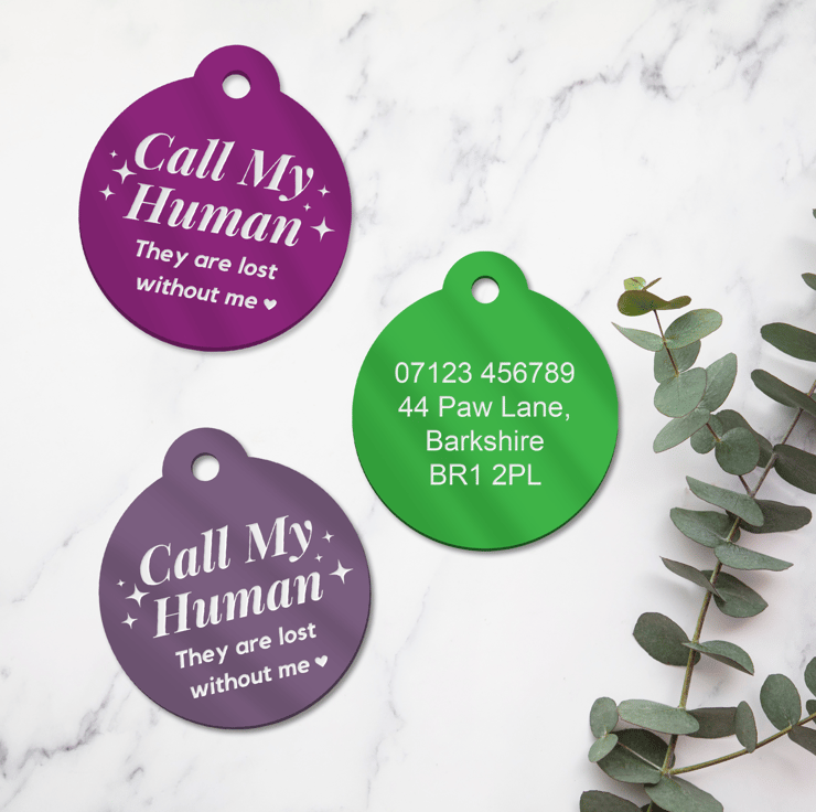Keep your furry friend safe and stylish with our personalised dog collar tag, featuring the heartfelt message "Call My Human, They Are Lost Without Me." Crafted from durable engraved metal, this tag ensures your pet's safety with clear, readable contact information on the back. Available in 8 vibrant colours, it’s easy to find the perfect match for your pet’s personality. Ideal for dogs of all sizes, this tag combines functionality with charm, making it a must-have for every pet owner. Secure your pet’s safety and show off their style with this unique, customisable collar tag.