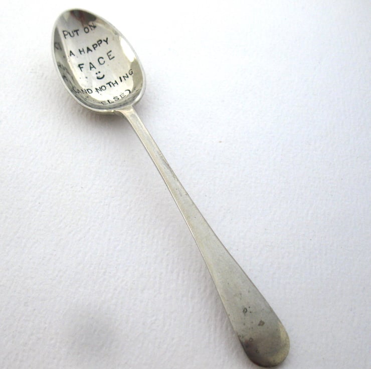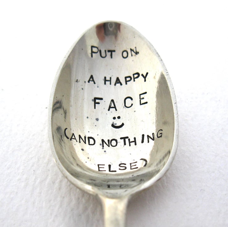 A vintage coffeespoon with a naturism theme, hand stamped 'PUT ON A HAPPY FACE (AND NOTHING ELSE)' with a little smiley face emoji. A great addition to your camping, caravan or campervan kit for the summer!