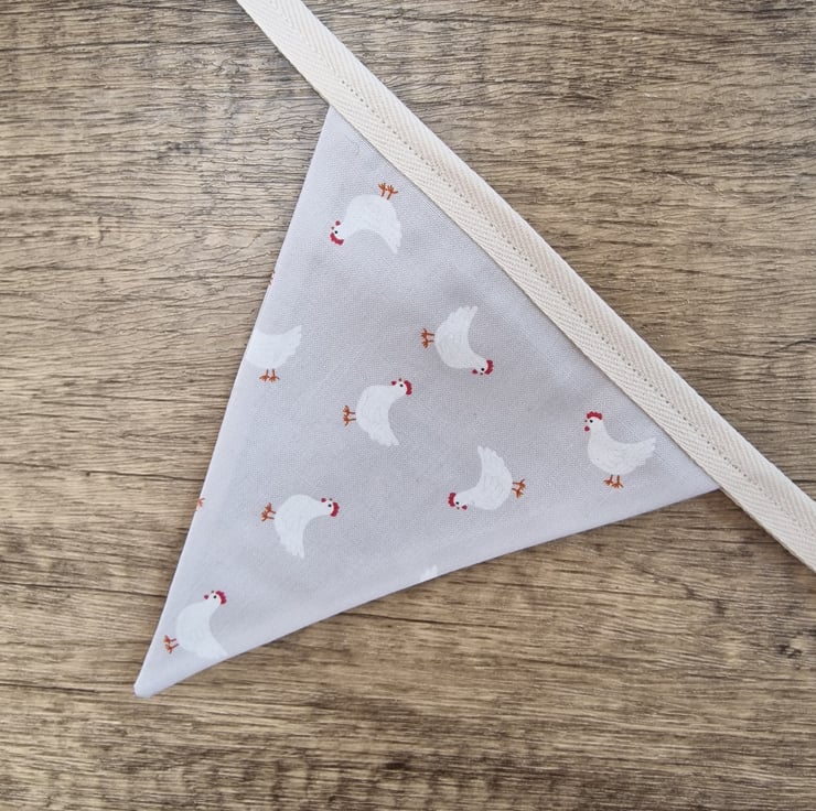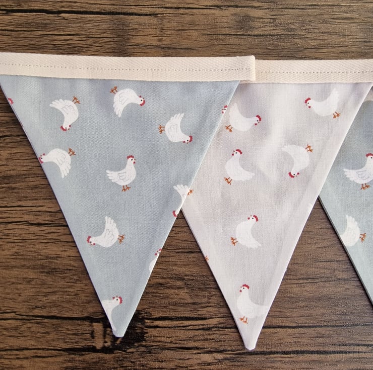 This chicken themed double sided fabric bunting is made with alternating duck egg blue and light grey fabrics with images of chickens.
