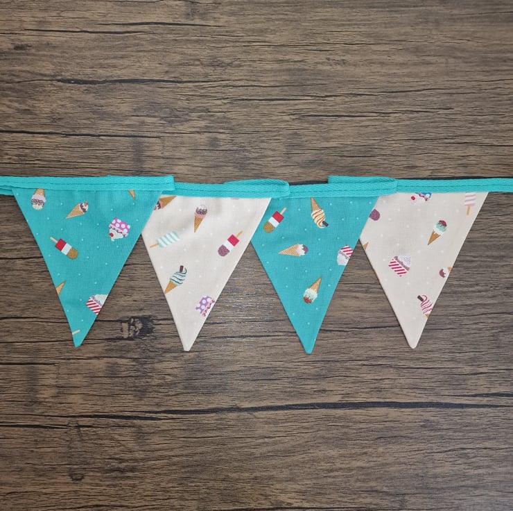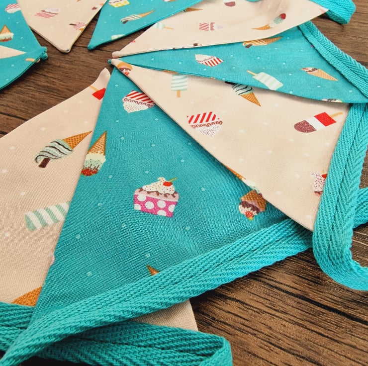 This Ice Cream themed fabric bunting comes in a standard length of 2.4 metres, and incorporates 10 double sided flags. Each flag is 16cm long and 14cm wide.