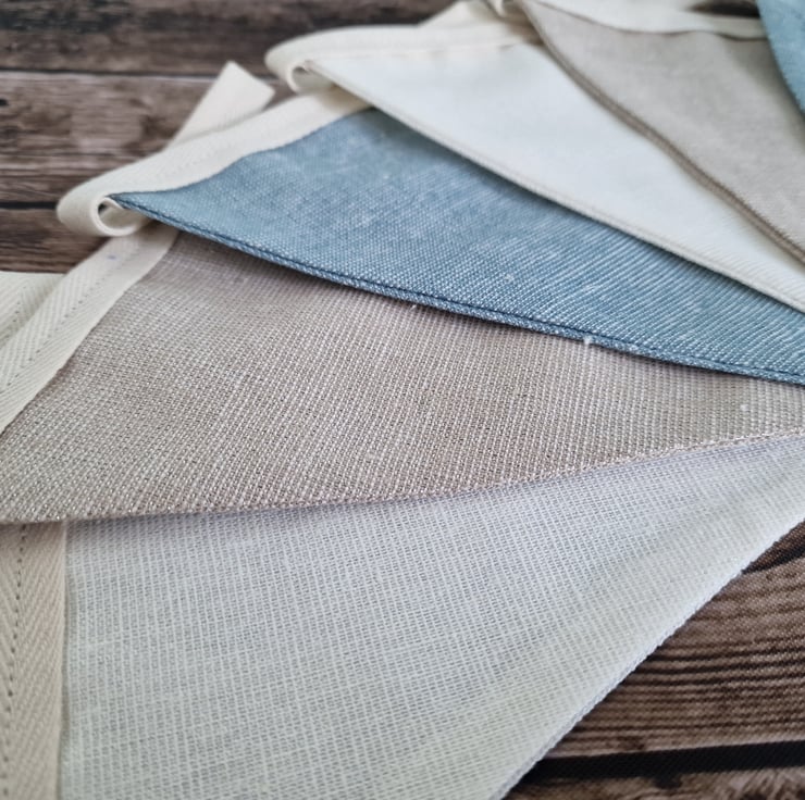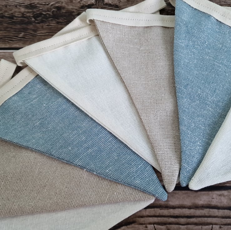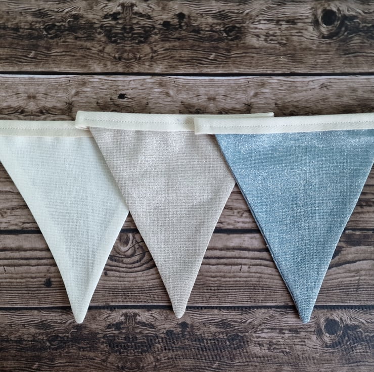 This pastel shades double sided fabric bunting is made with opal, oyster & water coloured fabric. The fabric consists of 50% linen, 40% cotton & 10% lurex which gives the fabric a lovely metallic shimmer. The bunting is finished with a cream coloured tape.