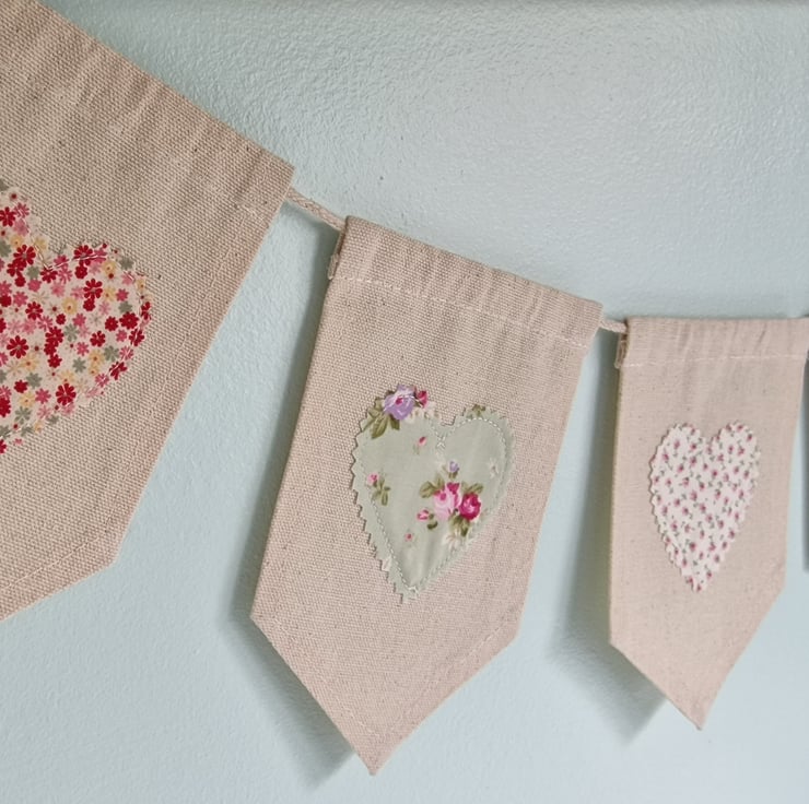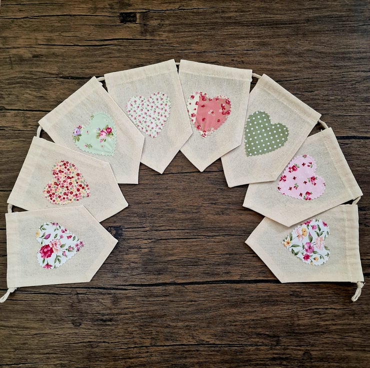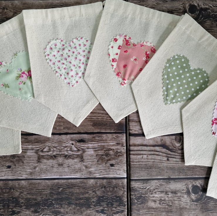 Each pennant flag has a ditsy floral heart shape sewn on, with a pink and green colourway. This bunting is perfect for any room in the home.