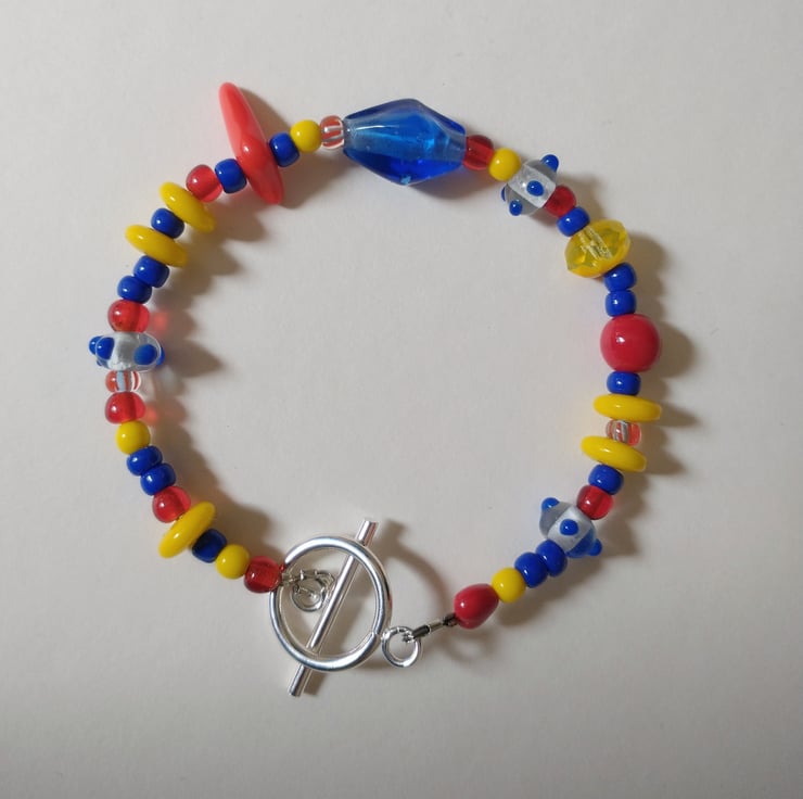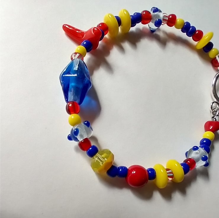 Bold and colourful bracelet featuring a collection of fabulous upcycled glass beads in primary hues of red, blue and yellow. There are some unique treasures from my bead collection here; including little clear glass beads with blue dots, a curious boomerang shaped red glass bead and yellow rondelle beads.A truly eclectic little collection! A joyful accessory bound to bring a ray of sunshine to your outfit and your day!