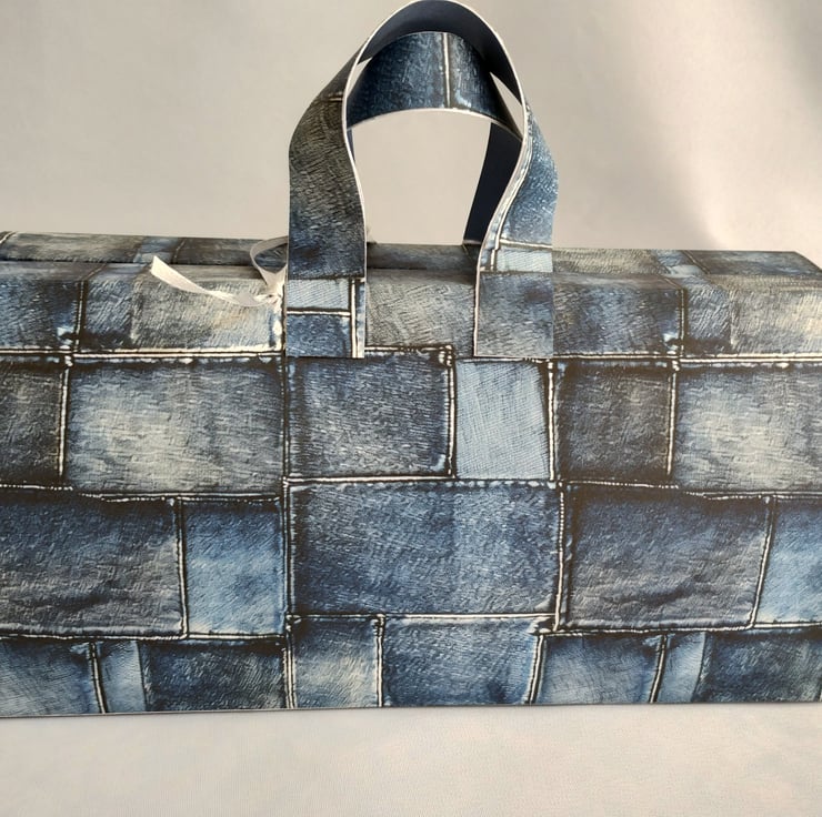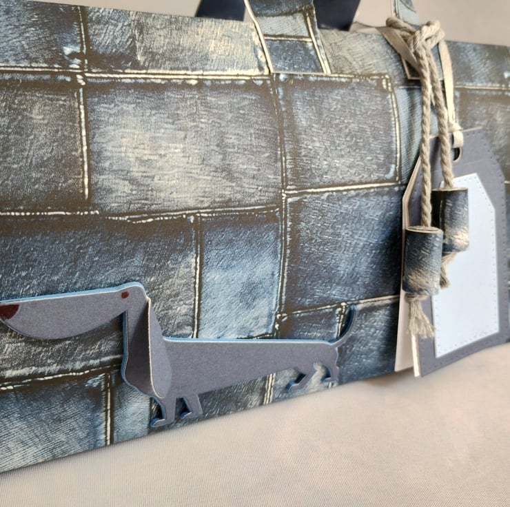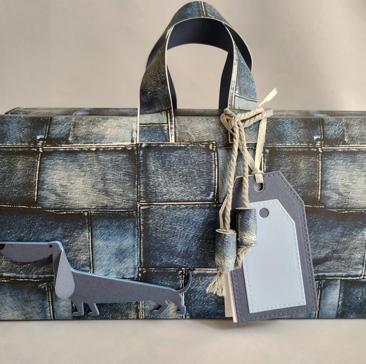I've made this gift box with premium quality matt finish denim patterned cardstock and toning denim blue cardstock to the sides, styled like a sports kit bag. It fastens at the top with two flaps. 'Milo' the dog is cut from the denim blue cardstock and raised on foam to give dimension. Two paper toggles tied with thick grey twine add to the detail and the gift box comes complete with matching tags, tied with silver grey satin ribbon for you to write your message.