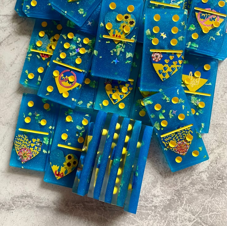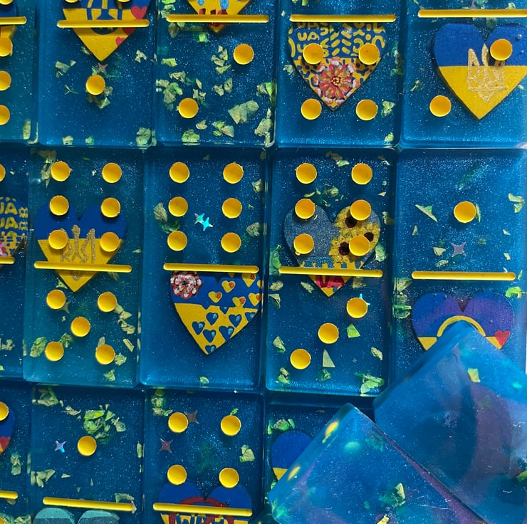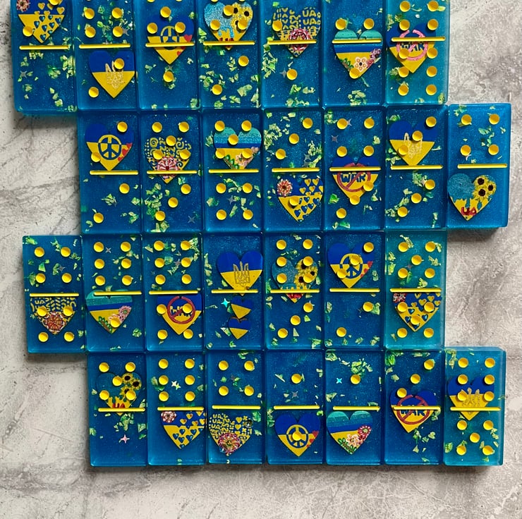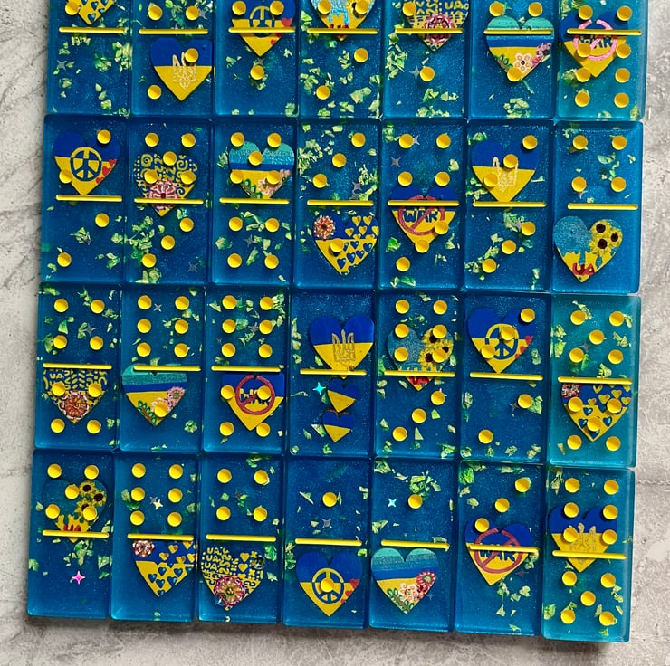 one-of-a-kind, Exclusive 28 piece / doublesix dominoes set in dedication to Ukraine with a “Spread love/no war” theme.