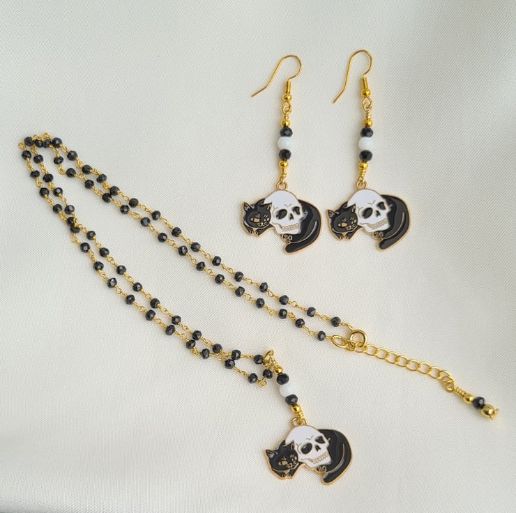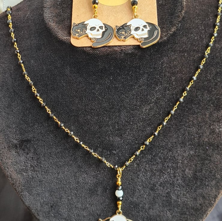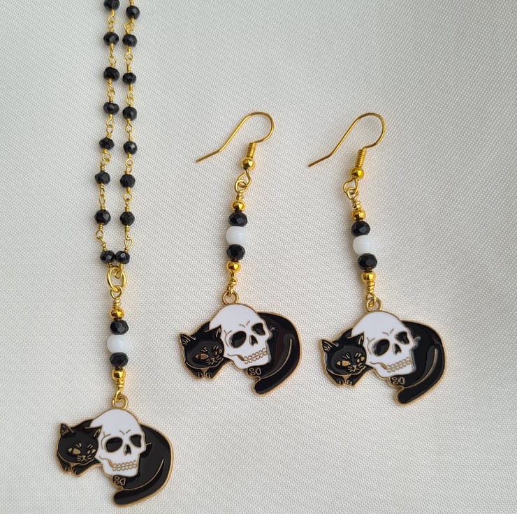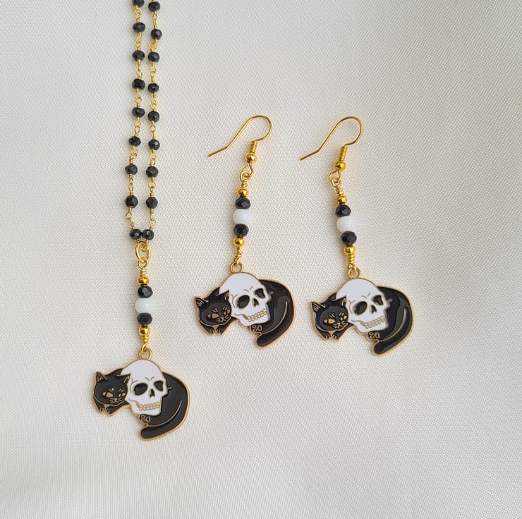 Creepy Cute Cat and Skull Necklace and Earrings Set.