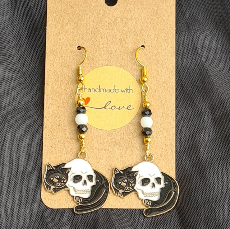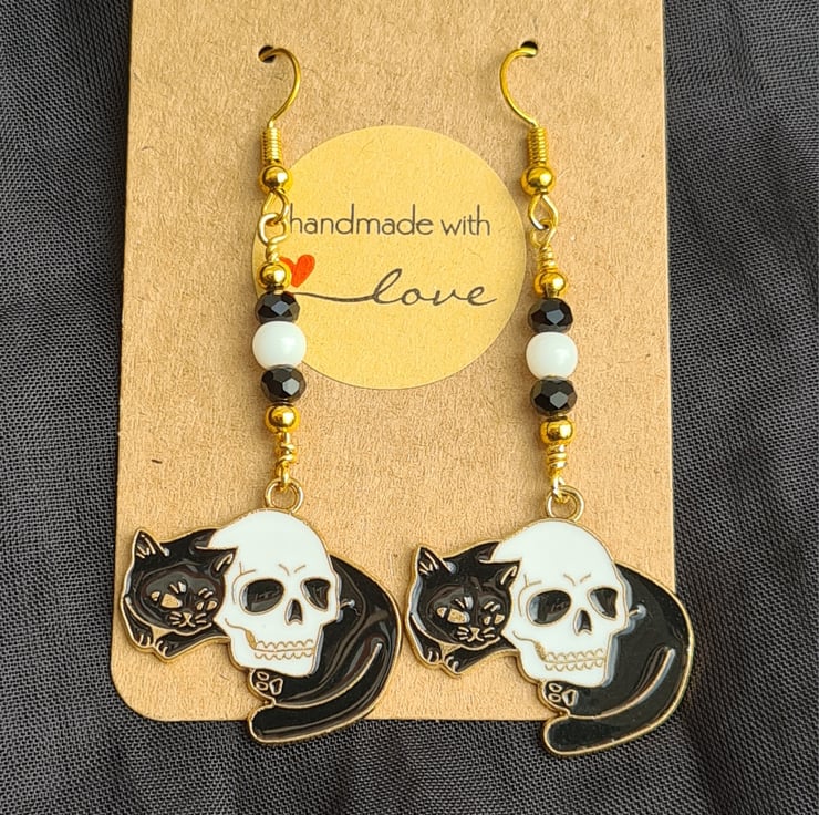 A cute Black Cat with creepy white Skull charm necklace. The charm dangles on a gold tone beaded chain. This unusual necklace comes with a pair of matching earrings with the same charms and colour scheme. Unique as a gift.