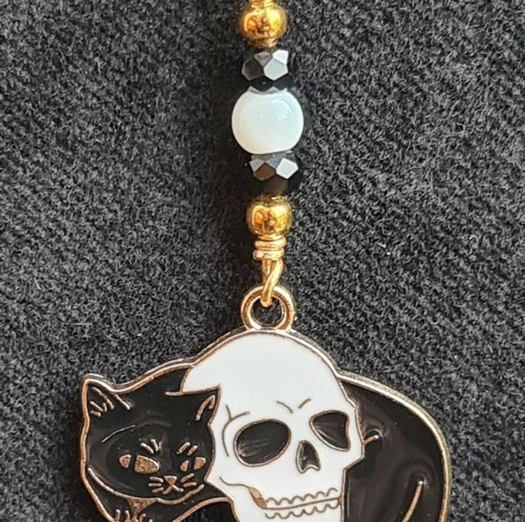 Cat and Skull Charm - Black/White on Gold tone metal.