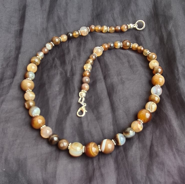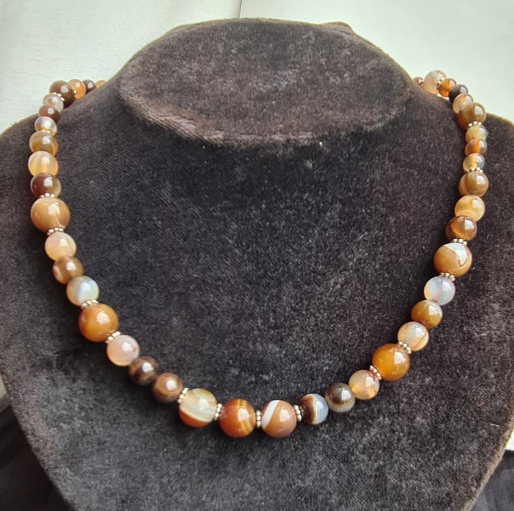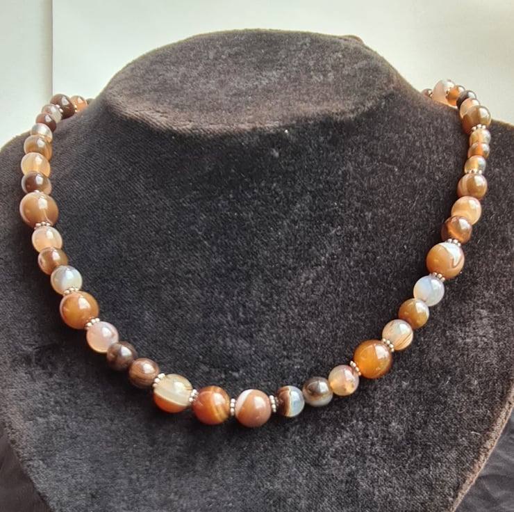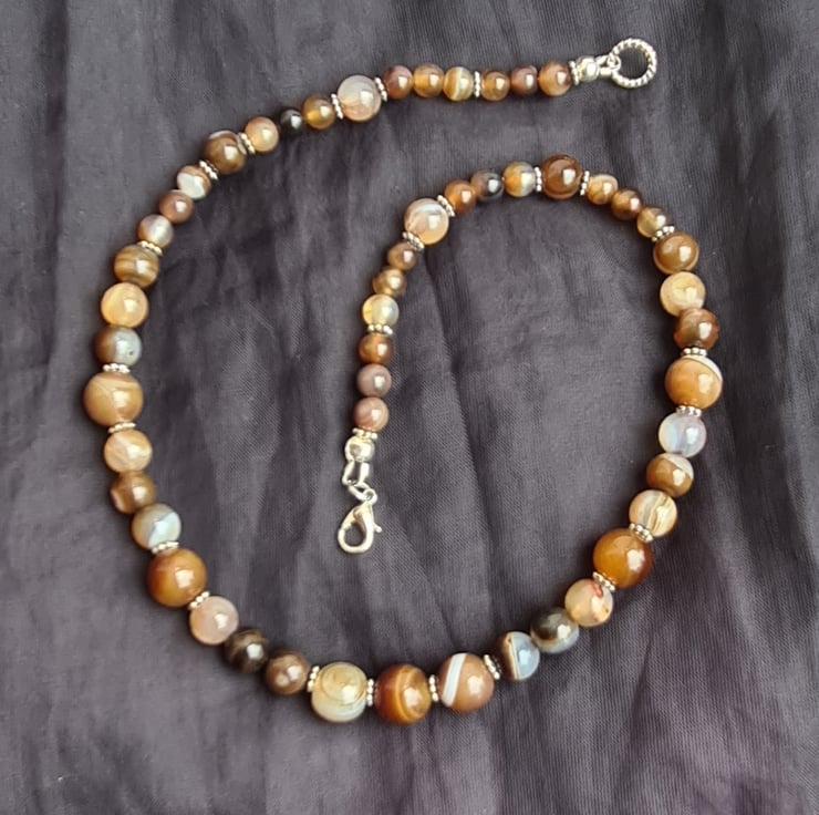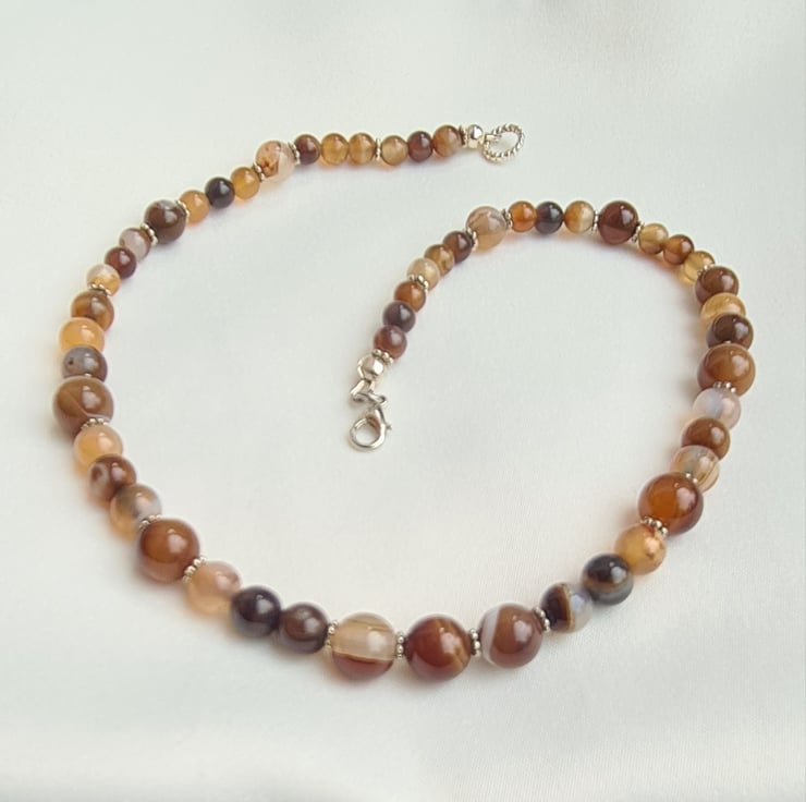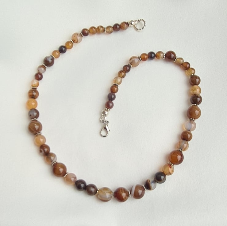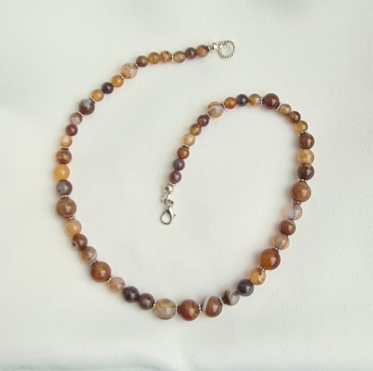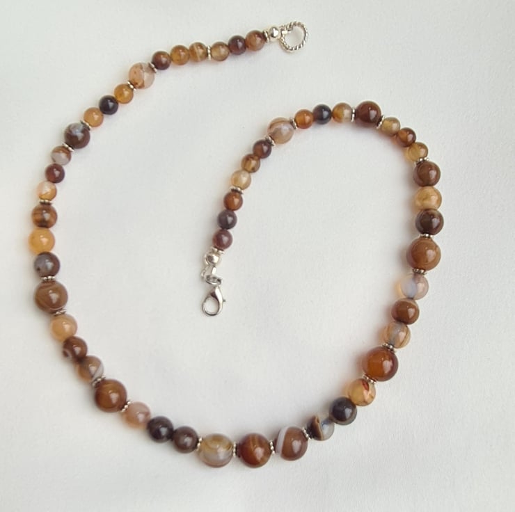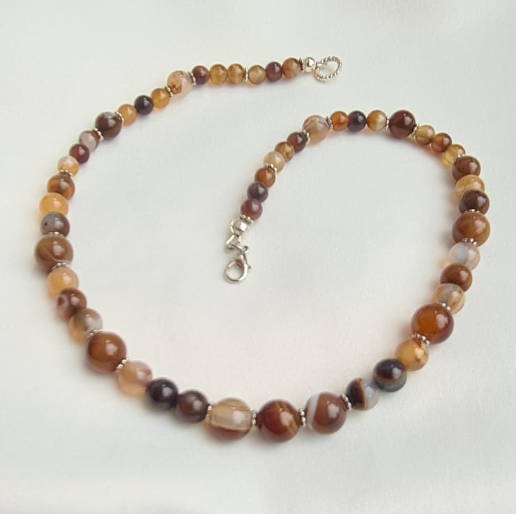 Necklace length is approx 17.1/2 inches (44.5cm approx) long. Fastens with a trigger clasp. Beads are 4mm, 6mm and 8mm round Coffee Lace Agate in various gorgeous Brown shades.