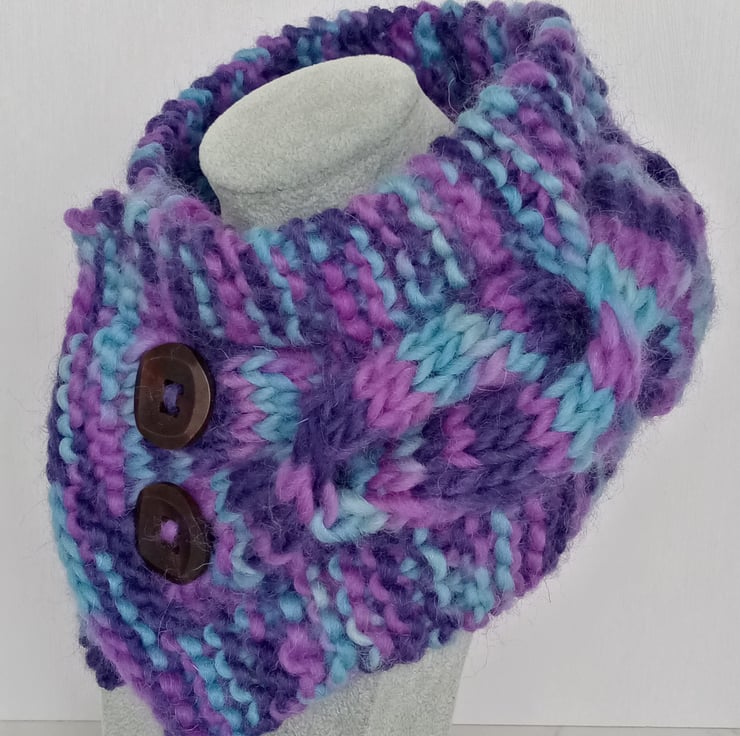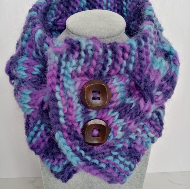 Cable knit neck warmer in purple and duck-egg blue with chunky dark walnut button closing.