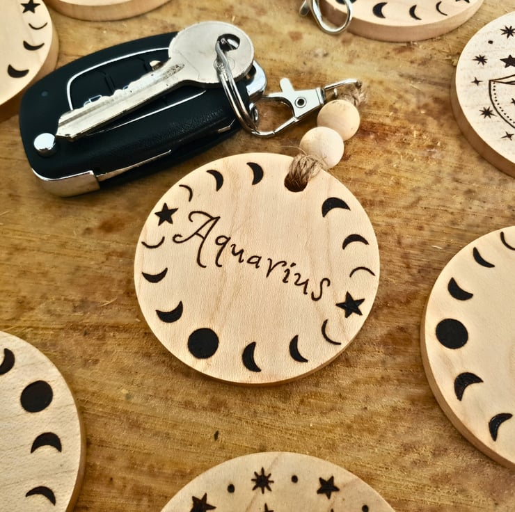 It is round shaped, with a diameter of approximately 6cm (2") and 6mm (1/4 inches thick).It is made from Sycamore wood, light in colour. Both sides are hand drawn with the method of Pyrography (wood burning), one displaying the symbol of the Aquarius zodiac star sign, while the other shows the word "Aquarius" surrounded by the moon phases. It connects with the metallic lobster type hook with natural twine, which is decorated with 2 wooden beads. The keyring is approx. 12.5cm long in total.