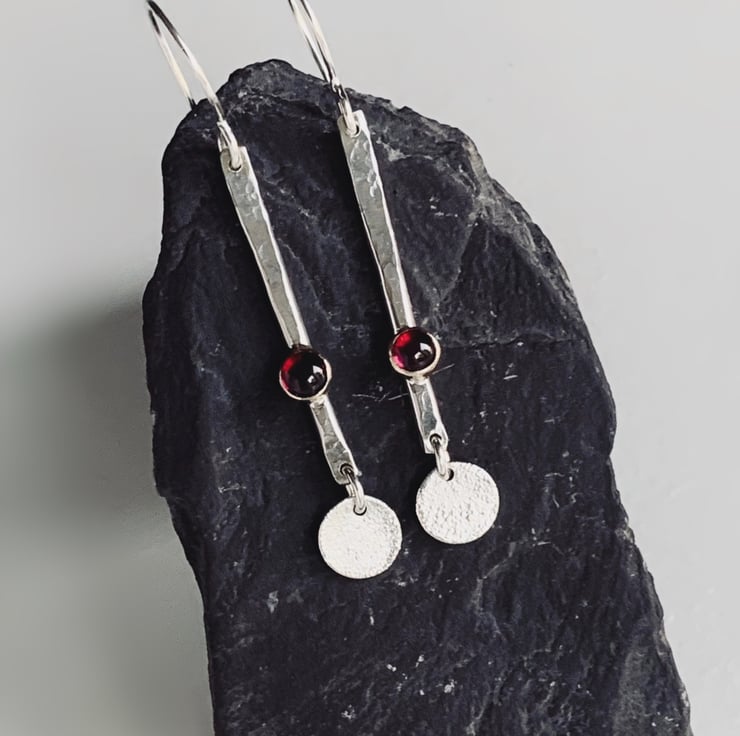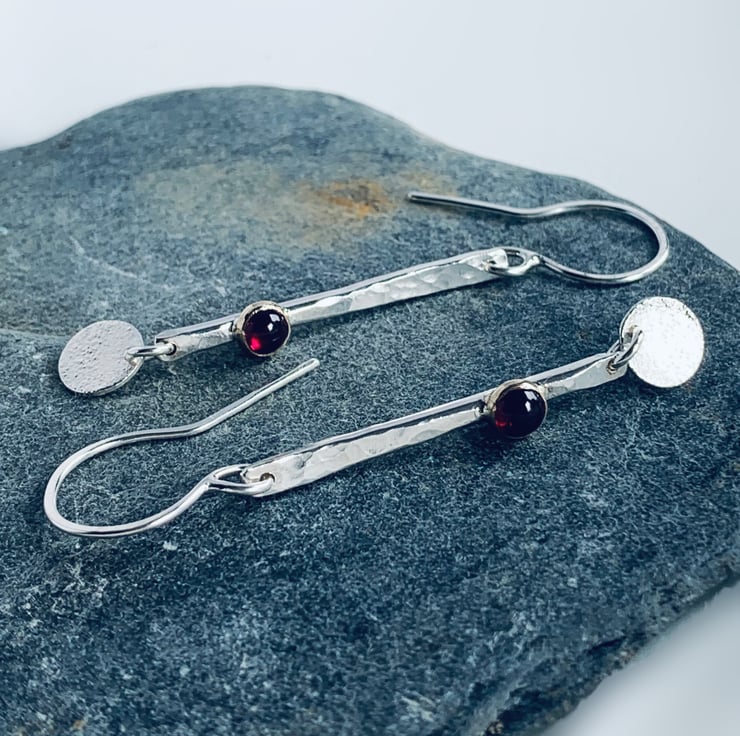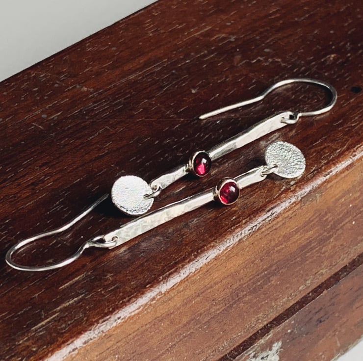These earrings are made from sterling silver 2 mm wire hammered textured and tumbled for strength and shine. I have set 4 mm round cabochon garnet gemstones near the bottom of the earrings. The garnets are set into a 9 carat gold secure bezel settings. The gold goes well with the deep red wine colour of the garnet. At the bottom of the earring I have added a little (Reticulated) heat textured disc Approx 6mm diameter, the disc dangles from the bottom, catching the light for extra sparkle.