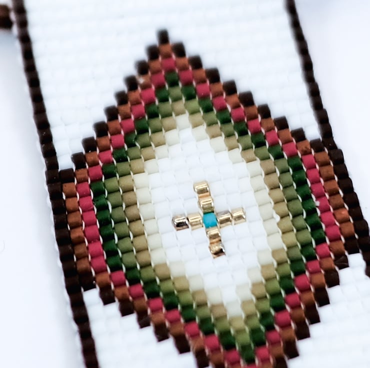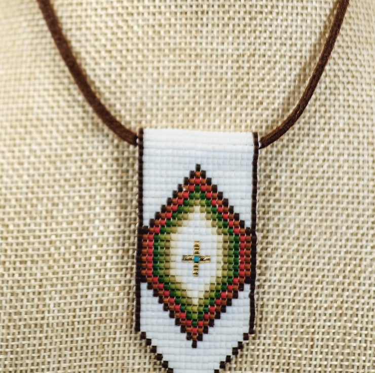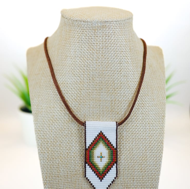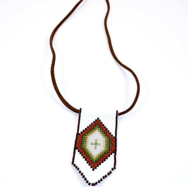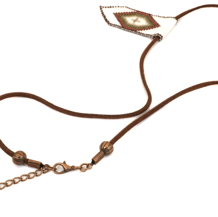 This beautiful necklace is perfect for all lovers of Native and Indigenous American beadwork. A diamond pattern is formed in matt brown, red, shades of green and gold against an off-white background. The pendant is hand-stitched from high-quality Japanese Delica glass beads and threaded onto vegan ‘suede’, making this necklace strong and durable. The necklace is finished with an antique copper style clasp and extension chain.