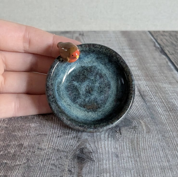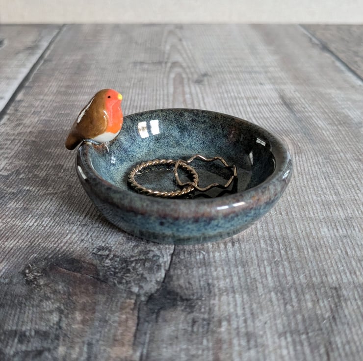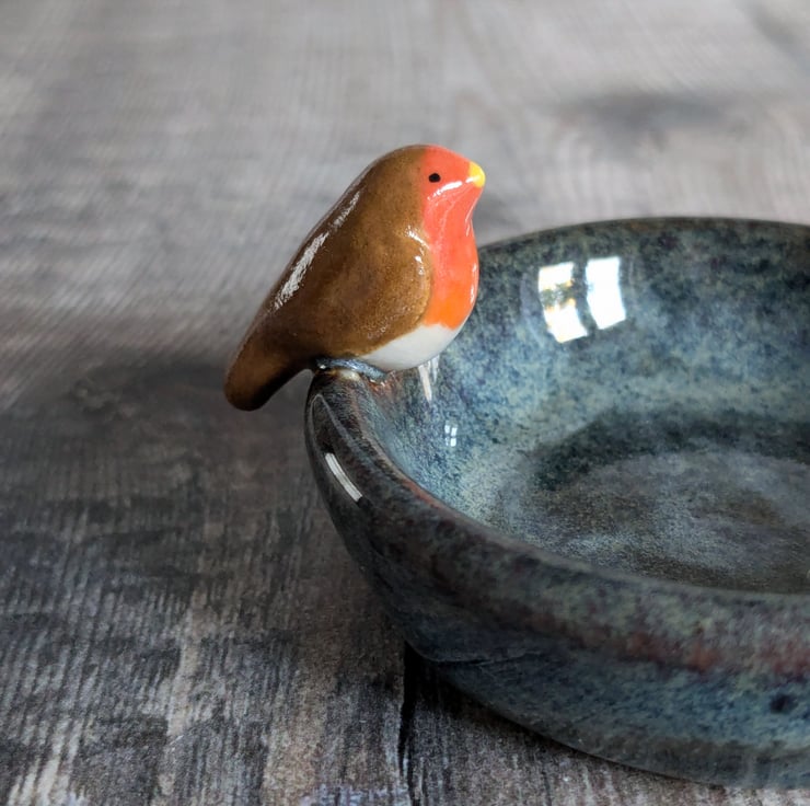A small ceramic ring dish, wheel thrown in a white stoneware clay. A hand sculpted, hand painted robin perches on the rim. The dish is glazed in a blue brown glaze which has lovely variations across the surface where it's thicker or thinner.