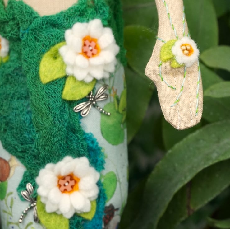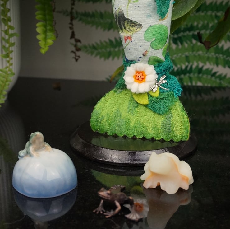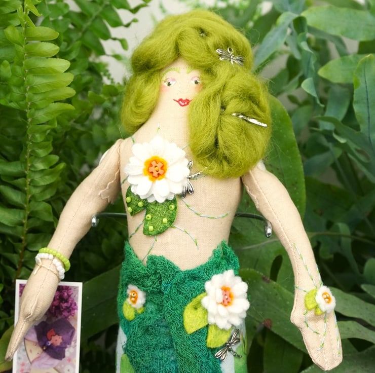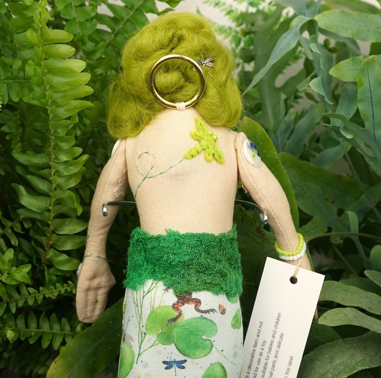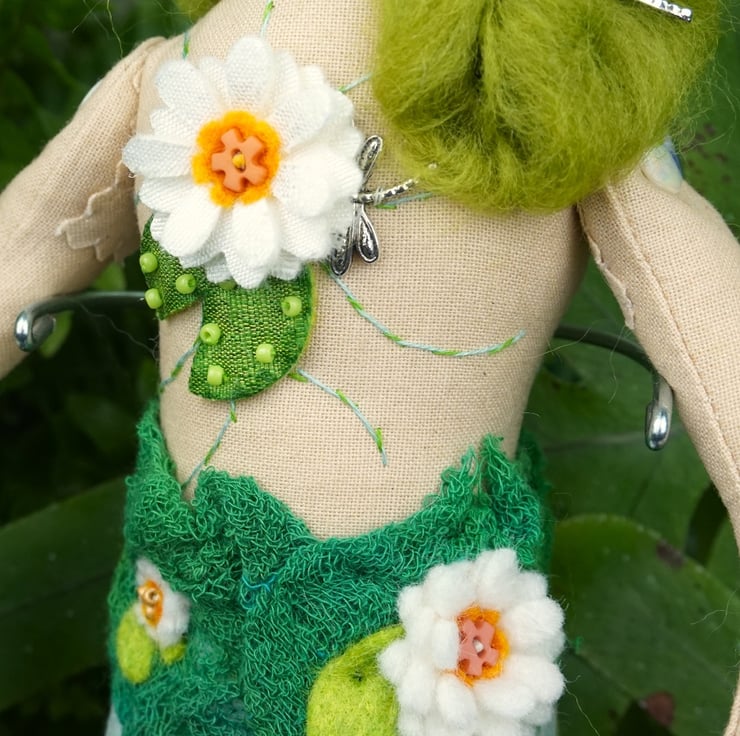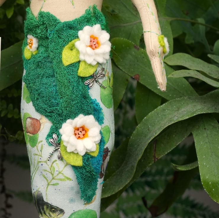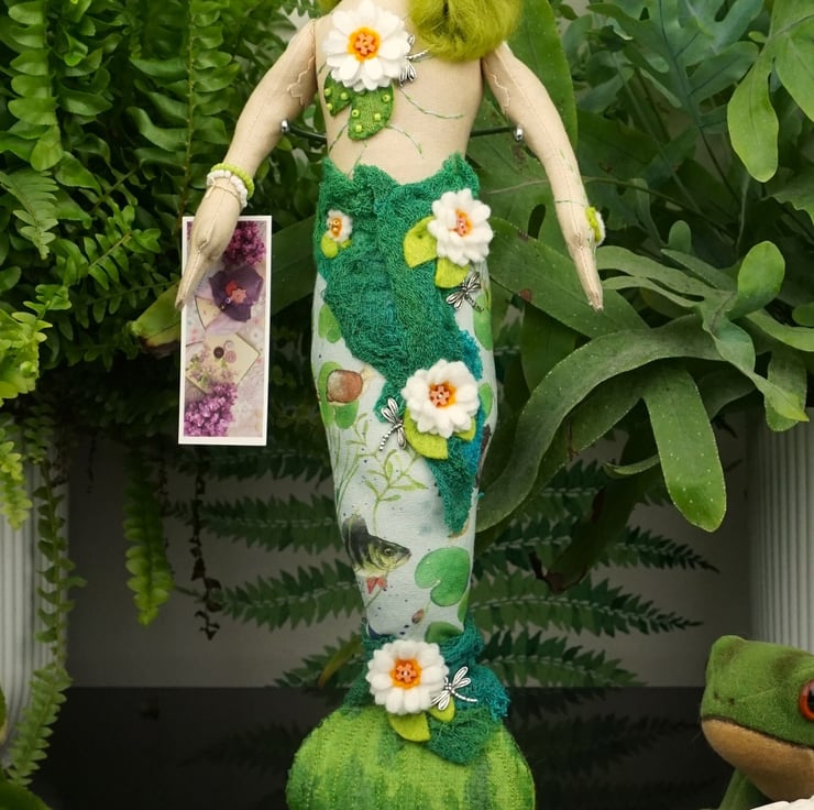 Melusine is a tiny one of a kind lily pad mermaid, a new pattern and a smaller size. With silk and felt detailing accentuated with dragonfly themed charms and hand dyed scrim, she has a lily pad fabric tail with a silk fin. Inspired by this Acufactum fabric i wanted to create a lily pad rivermaid in green. This tiny mermaid has her modesty preserved with a well placed lily pad, which is embroidered and the design repeats on her hand.