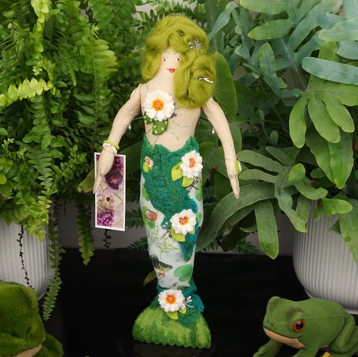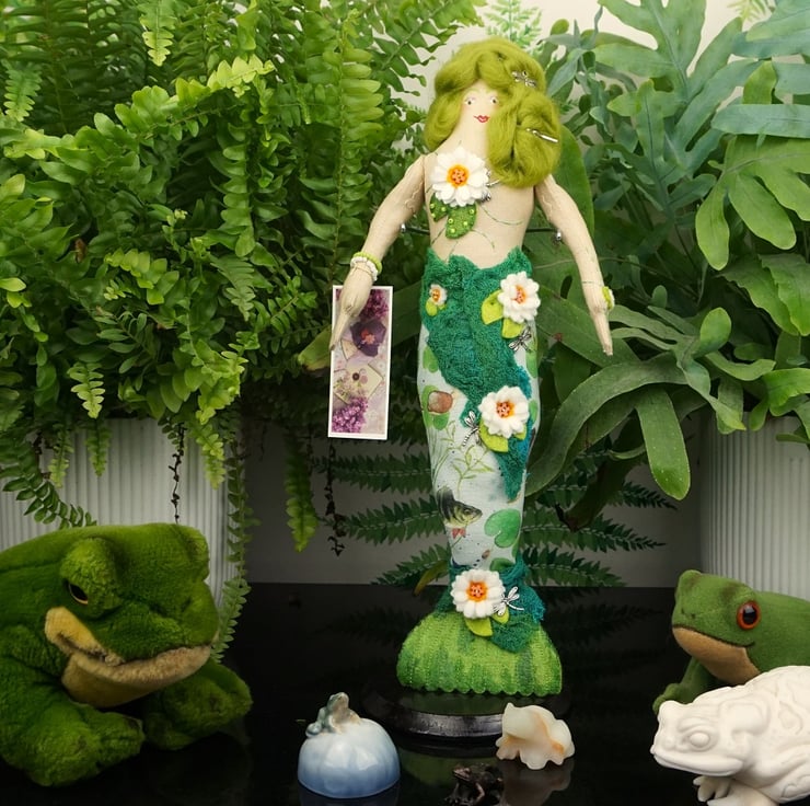 This little mermaid is a one of a kind lily pad mermaid inspired by the old folk tale of the river maid who married a king, with the one condition he never saw her bathe but he broke the rules and she left him with a curse.