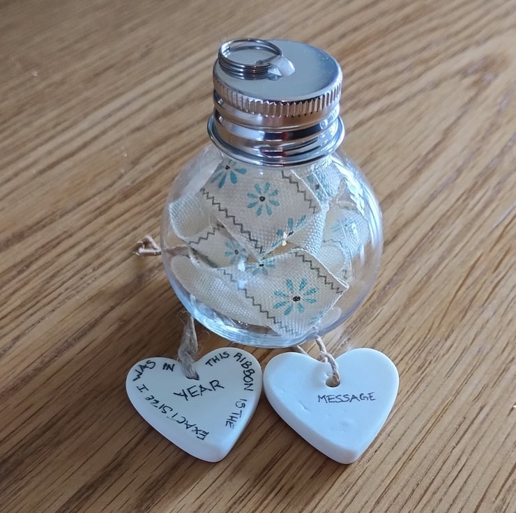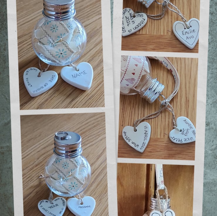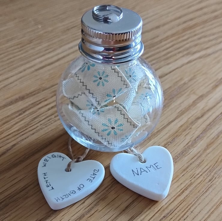 This beautiful Keepsake New Born Baby's Bauble comes with 1 Bauble, 1 Bunny and 2 Linen Hearts capturing all those precious details from the day they arrived into your life. The shatterproof bauble contains a piece of ribbon the length of your baby. The linen hearts will show their NAME and 'This ribbon is the same size I was in 2025' The second heart will show DATE OF BIRTH, TIME OF BIRTH, LENGTH and WEIGHT. There is room for a very short message (see photograph). You can select the two bunnies in any colour from wool felt selection shown in the photograph.