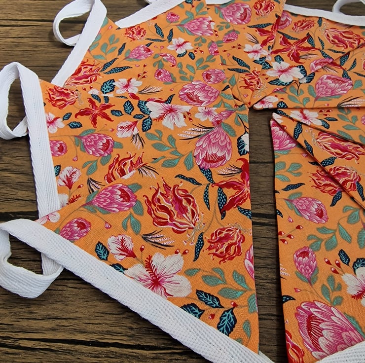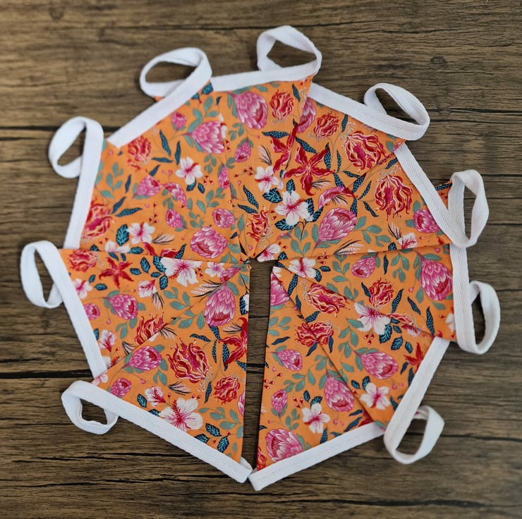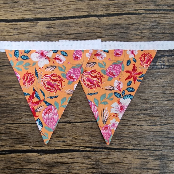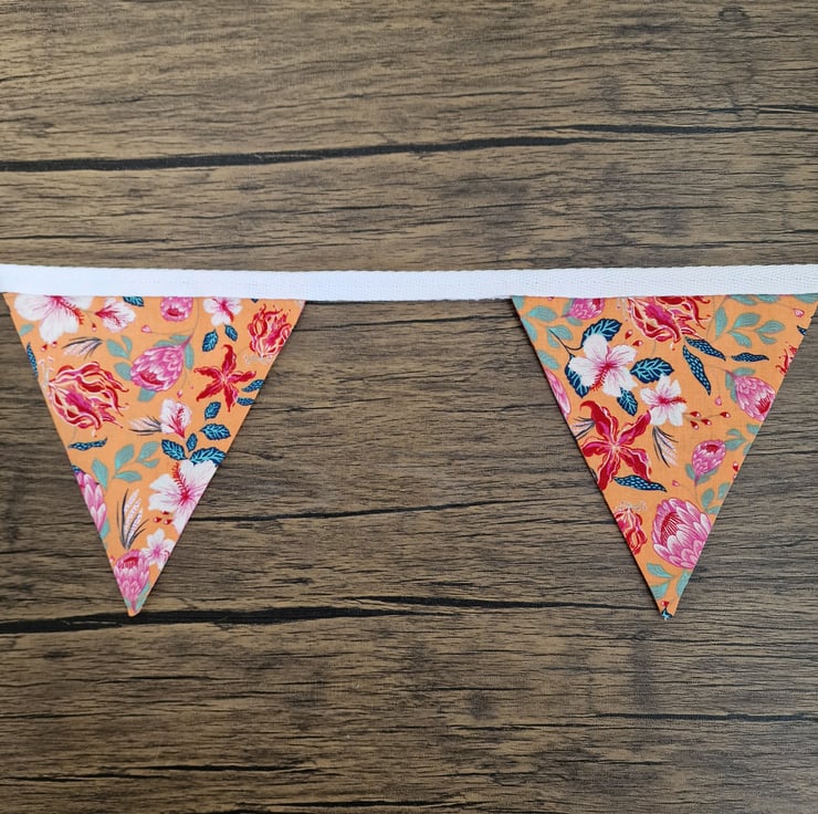 This peach floral bunting comes in a standard length of approx. 2.5 metres, and incorporates 10 double sided flags. Each flag is 16cm long and 14cm wide.