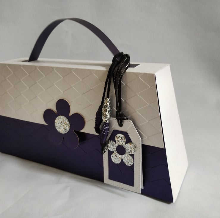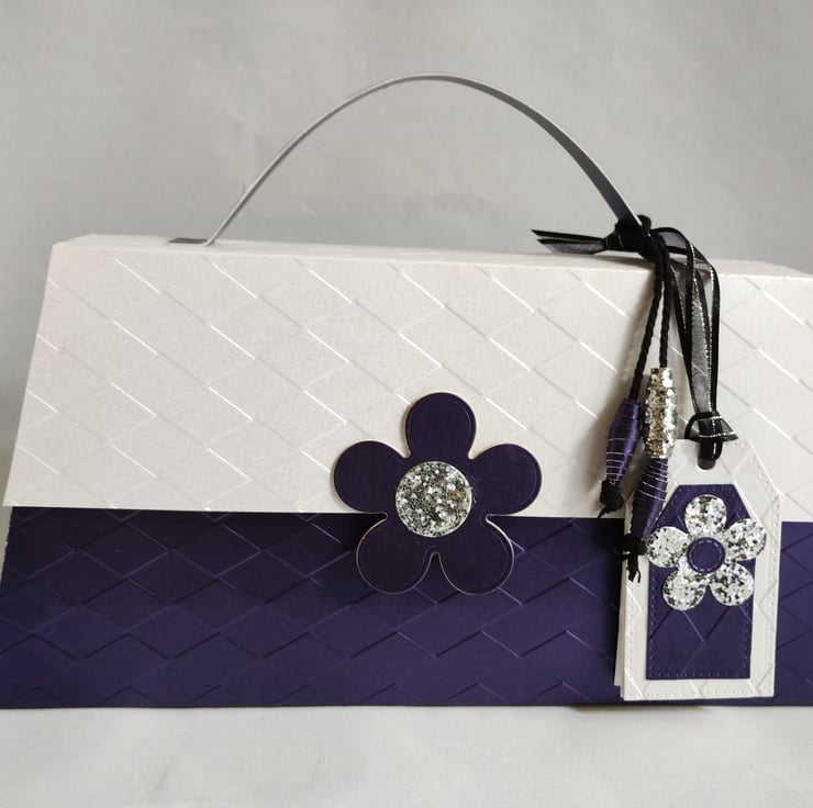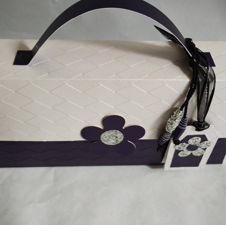 This stylish long purse style gift box is inspired by Mary Quant and all things mod and 60s. It can be made in different colours to order. It tapers from bottom to top and is made from quality pearl finish cardstock in deep purple and white which I have embossed with an argyle diamond pattern. It features a large five petal daisy with silver sequin centre to the front flap. Detail is added with matching paper beads and set of co-ordinating tags for you to write your message. The beads are tied with thick black twine and the tags are tied with black satin edged organza ribbon with a silver thread.