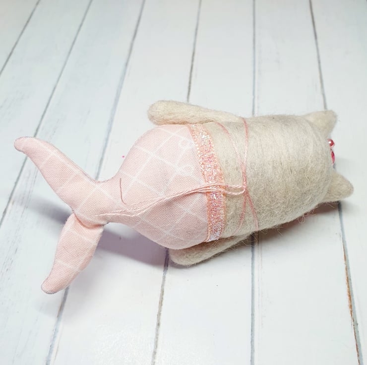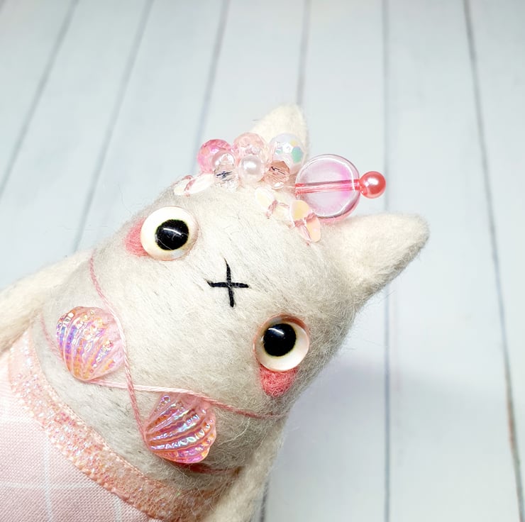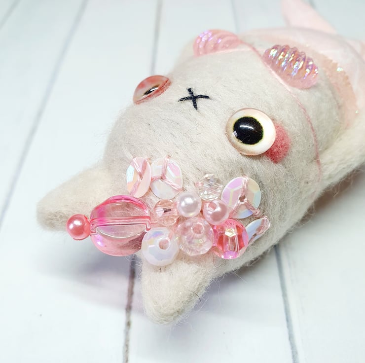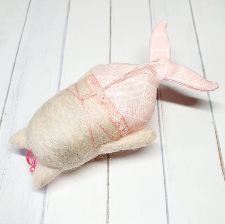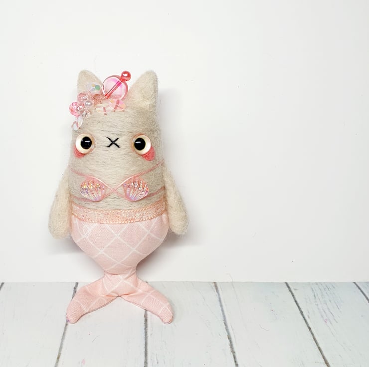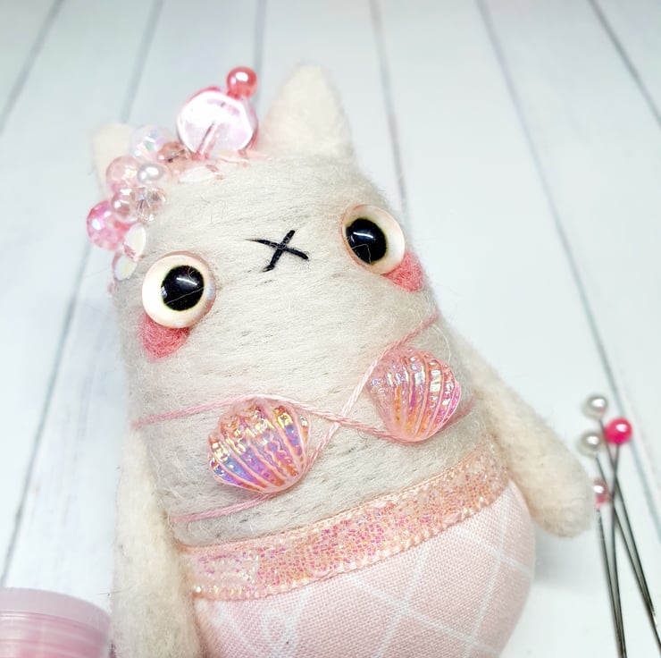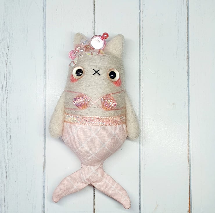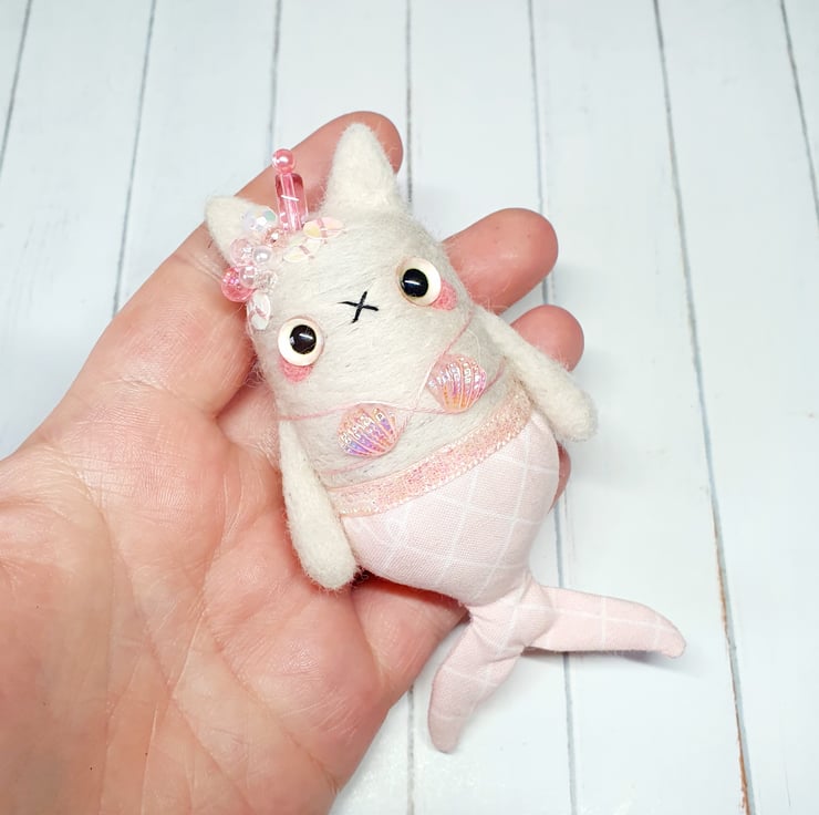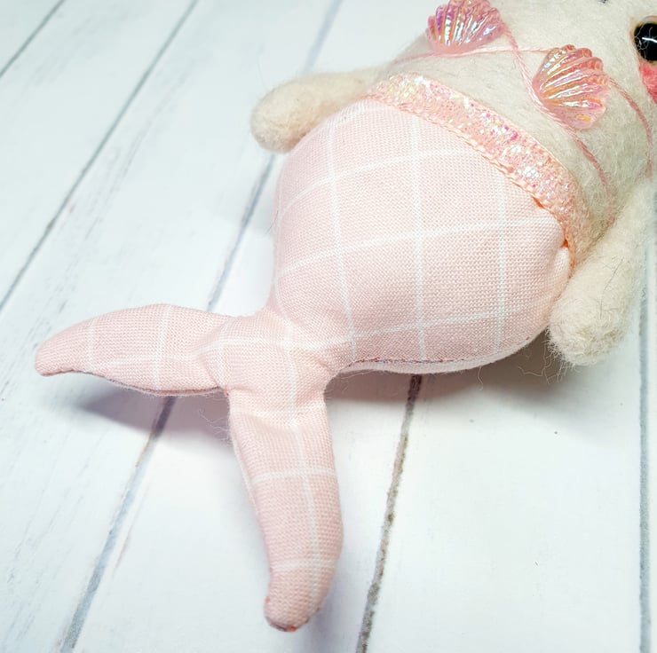 Sweet, miniature art doll with shiny shell bra and glass eyes. This little mermaid is needlefelted with hand embroidered nose and mouth and sewn cotton tail stitched into place. Their tail is topped with sparkly trim and their head is adorned with beads and sequins hand sewn into place. A unique little doll that comes with a transparent loop hanger. This mermaid measures roughly 11cm tall. This is for decorative purposes only and not a toy.