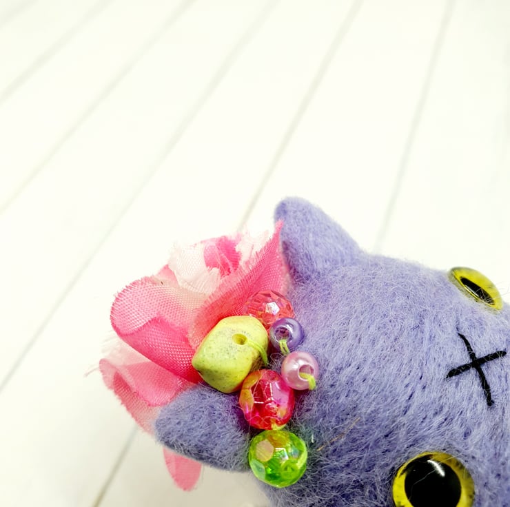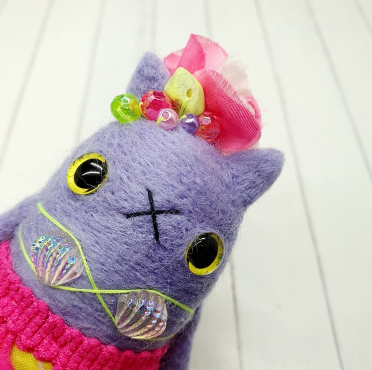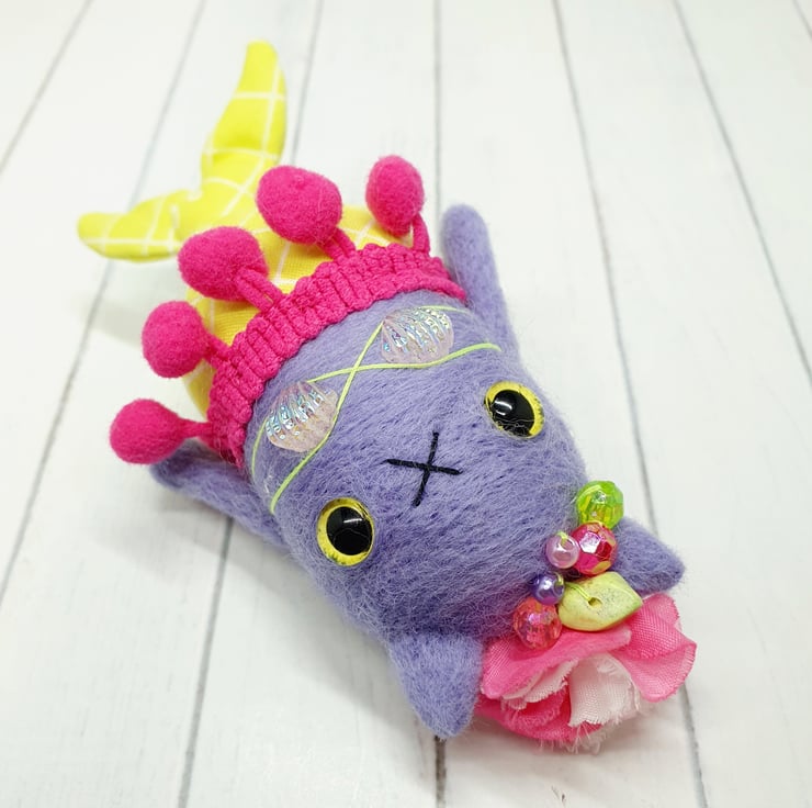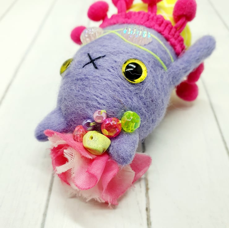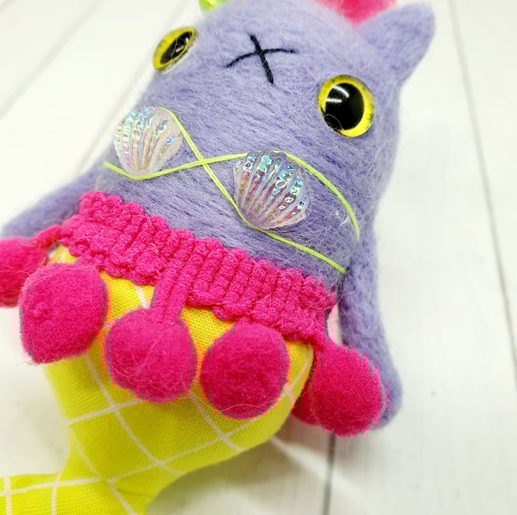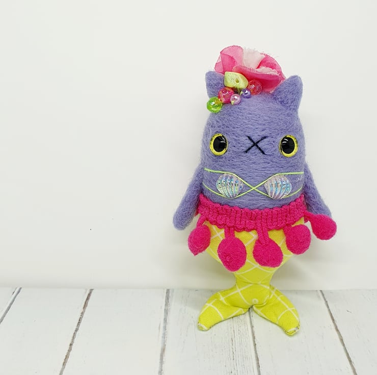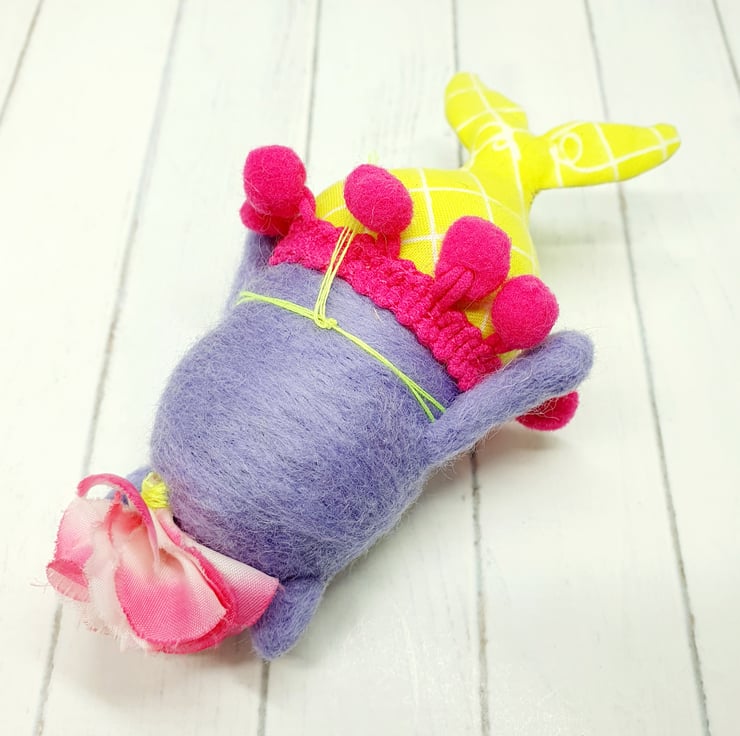 Tropical, miniature art doll with shiny shell bra and glass eyes. This little mermaid is needlefelted with hand embroidered nose and mouth and sewn cotton tail stitched into place. Their tail is topped with pompom trim and their head is adorned with faux petals and beads hand sewn into place. A unique little doll that comes with a transparent loop hanger. This mermaid measures roughly 11cm tall. This is for decorative purposes only and not a toy.