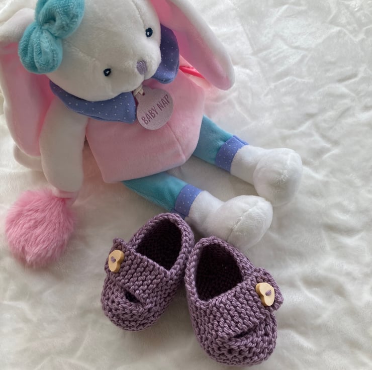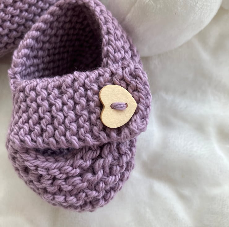 Hand-knitted baby shoes to fit from 0-3 months. I have knitted these ultra cute baby shoes in a super soft mauve-coloured cotton yarn and finished them with a heart-shaped button on the chunky straps. A gorgeous way to finish off an outfit and make a great baby shower gift. Lots more colours coming soon!