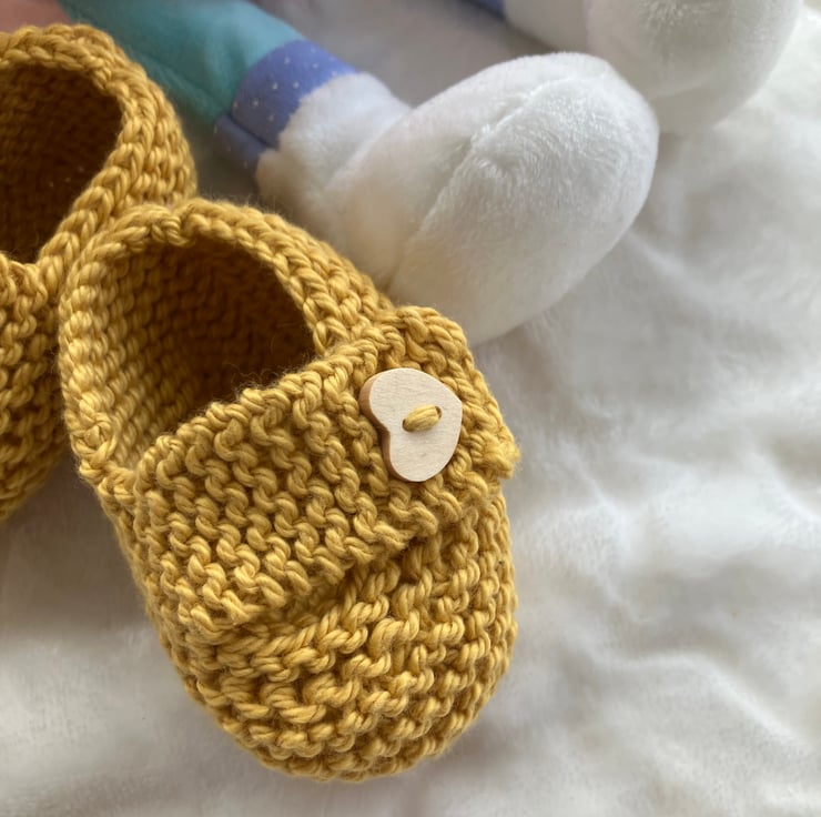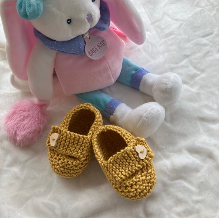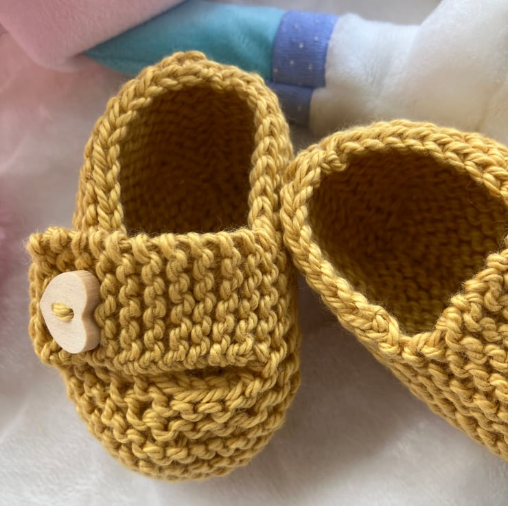 Hand-knitted baby shoes to fit from 0-3 months. I have knitted these ultra cute baby shoes in a super soft ochre-coloured cotton yarn and finished them with a heart-shaped wooden button on the chunky straps. A gorgeous way to finish off an outfit and make a great baby shower gift. Lots more colours coming soon!