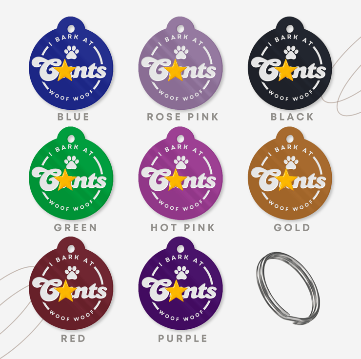 Make a bold statement with our "I Bark At C'nts" dog collar tag, perfect for pet owners with a sense of humour. Crafted from durable engraved metal, this tag combines functionality with a touch of cheeky charm. Personalise it with up to 56 characters of contact information on the back, ensuring your pet's safety. Available in 8 vibrant colours, it's easy to find the perfect match for your furry friend. This unique, customisable tag is not only practical but also adds a fun twist to your pet's accessories. Stand out at the dog park and keep your pet safe with this one-of-a-kind