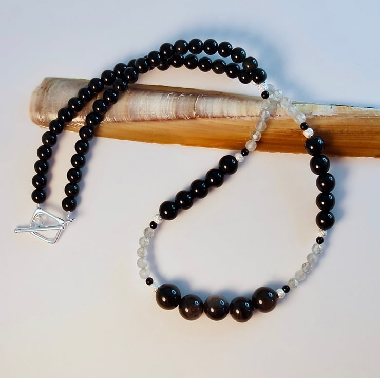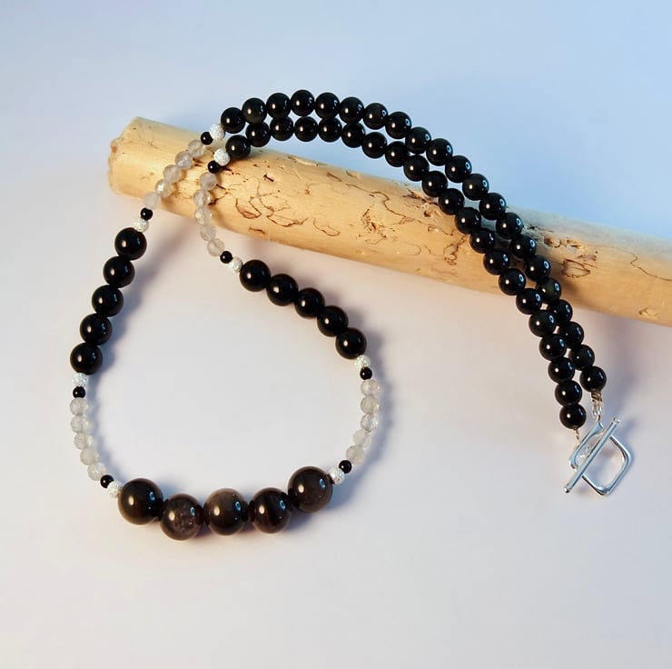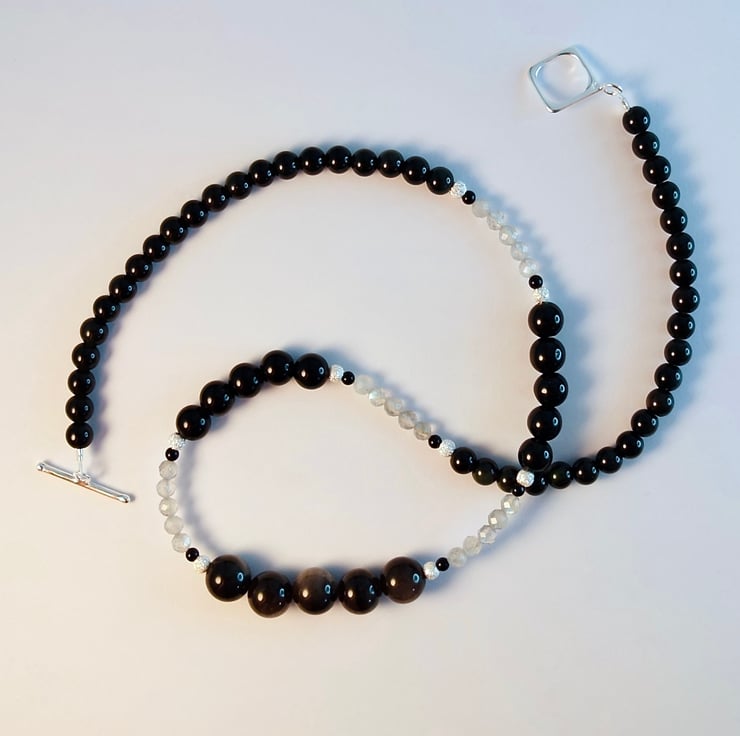 Monochrome necklace featuring a centrepiece of five Silver Sheen Obsidian beads set between rows of five AAA grade faceted labradorite highlighted with 2mm black Onyx and 3mm sterling silver 'stardust' beads.