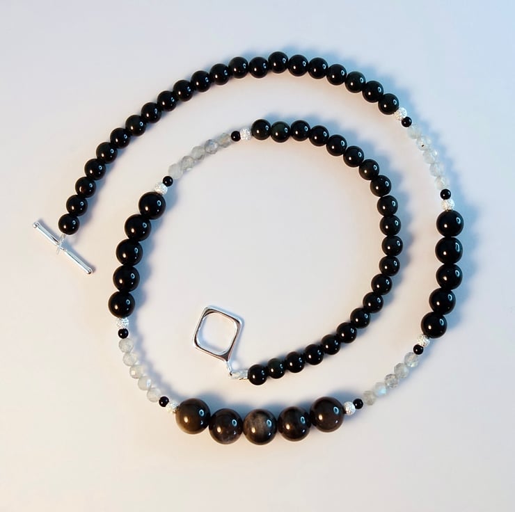 The necklace graduates to 6mm and 4mm Obsidian, separated by more Labradorite and silver.