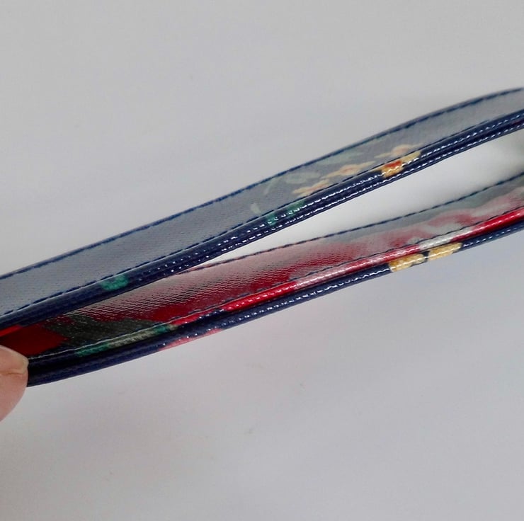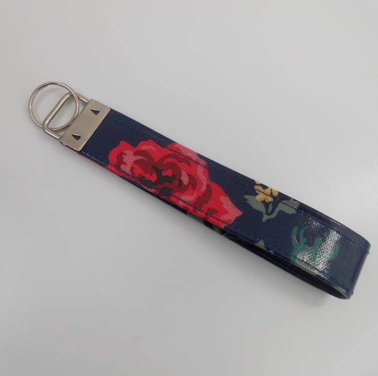 This wrist strap key ring is made using an oilcloth (wipe clean) fabric which has a navy blue background with floral print.