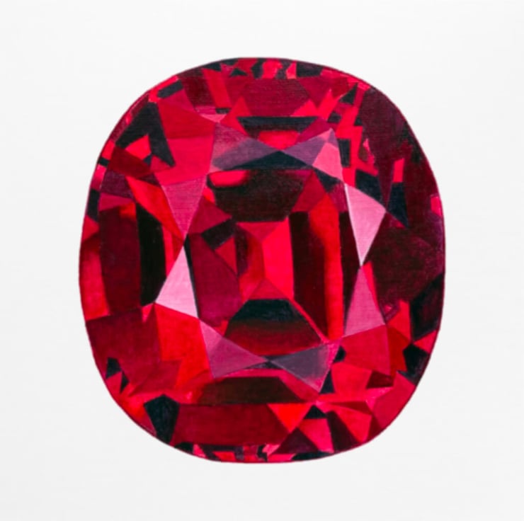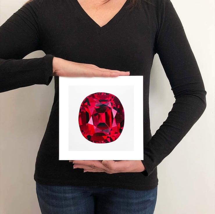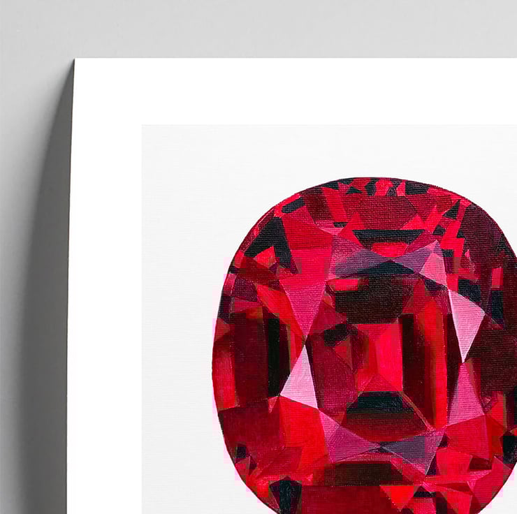 A gallery quality fine art giclée print reproduction of an original painting of a red ruby jewel which I painted in 2021.