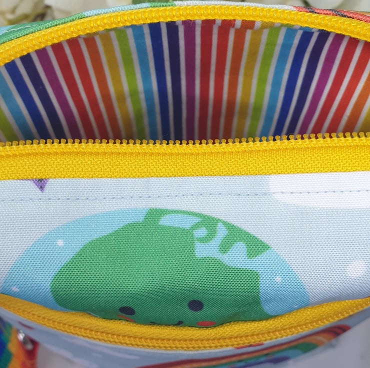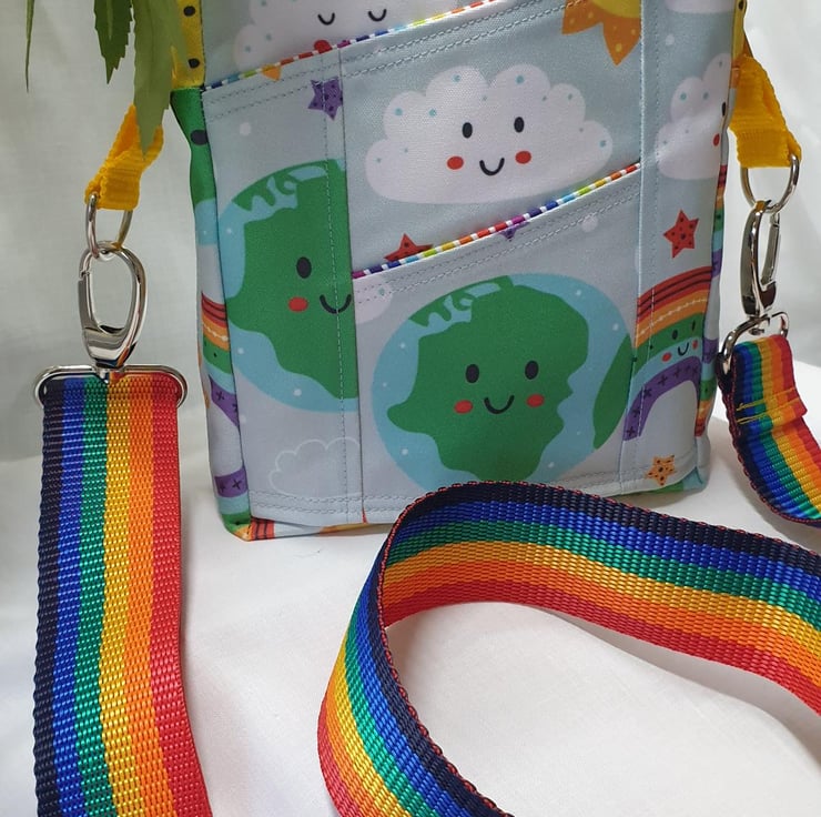 Fun crossbody bag made from waterproof canvas with cotton interior. One outer zip pocket, 2 outer slip pockets and one interior slip pocket.