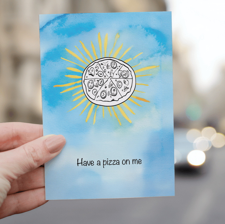Is it someone's birthday? Or perhaps you just want to treat a pizza-lover as a surprise. Why not put some cash in this greeting card and make their day with a pizza on you!