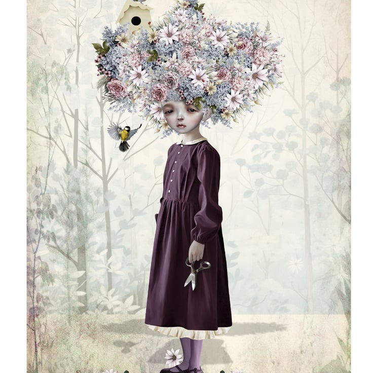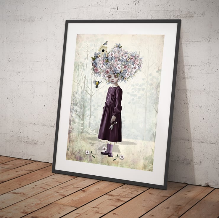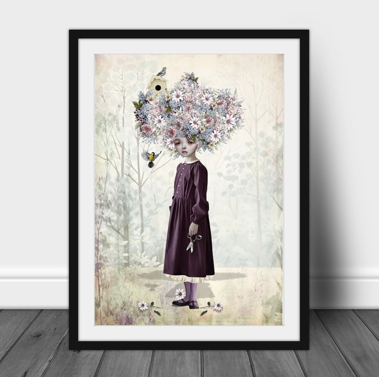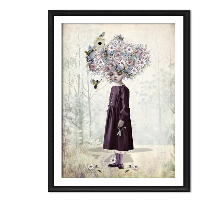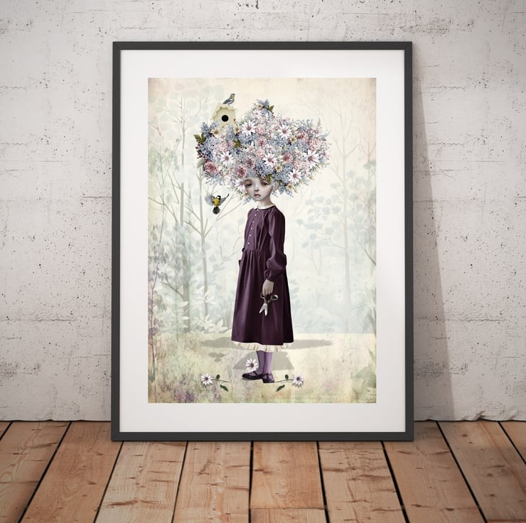 Introducing my Enchanting Flower Girl Art Print, a delightful addition to your home decor. This surreal art features a girl whose hair blooms into a vibrant bouquet, infusing any space with a touch of quirky elegance. Let her presence grace your walls and invite a breath of fresh, floral-inspired enchantment into your living space.