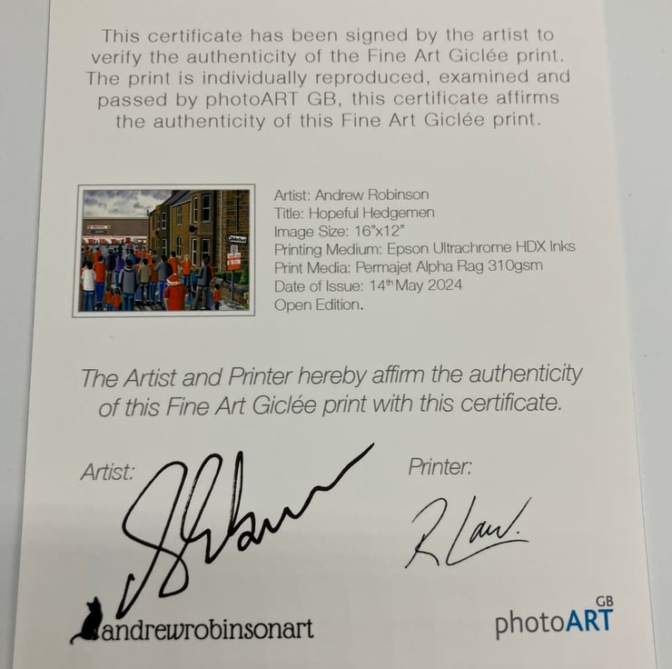 The framed print comes with a 'Certificate of Authenticity' which documents the details of the original painting and the art print. The Certificate of Authenticity is affirmed with a signature from both myself (the artist) and the printer.
