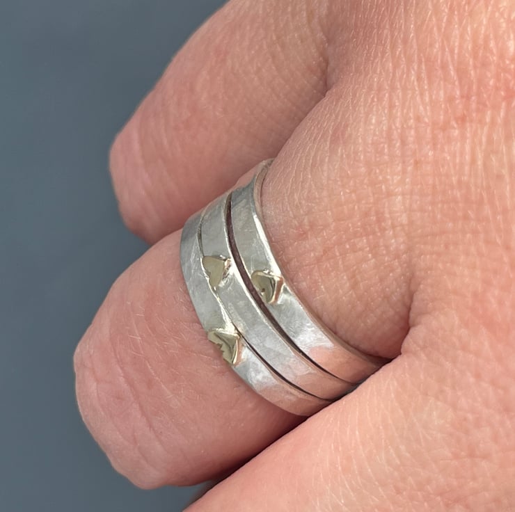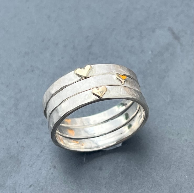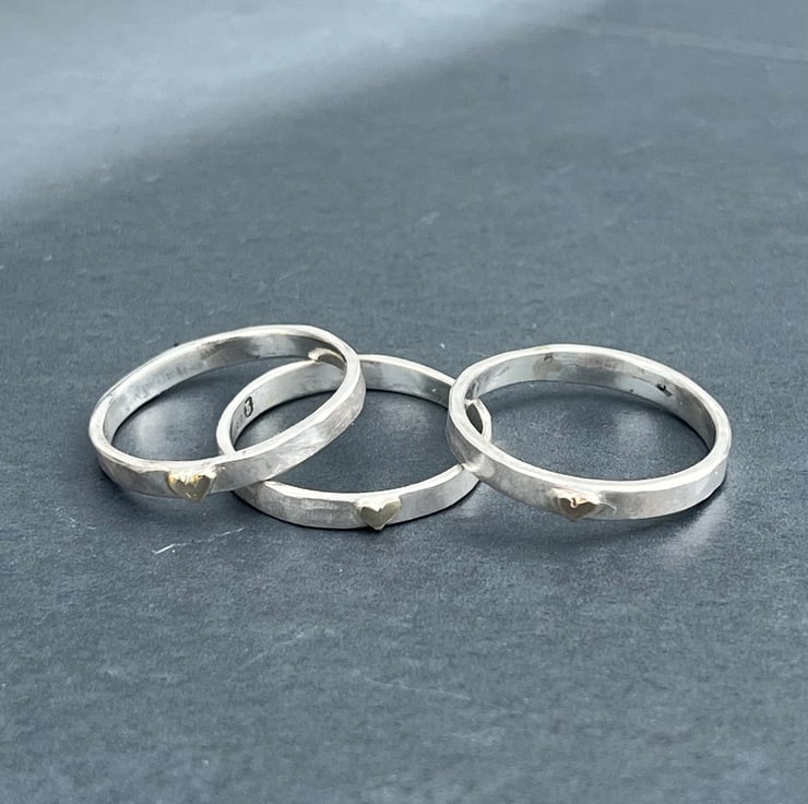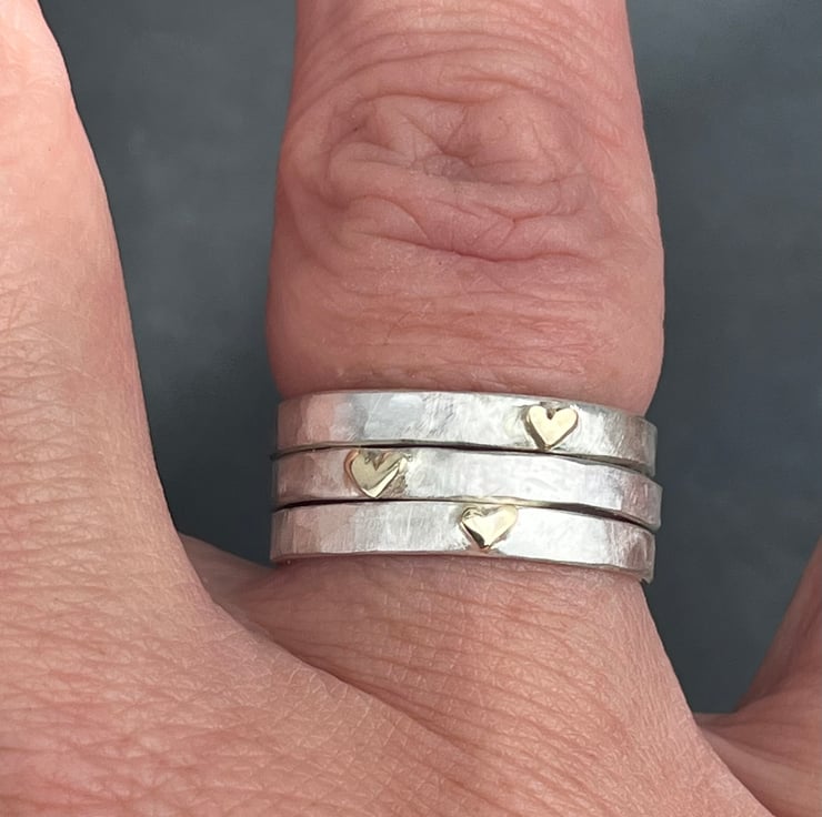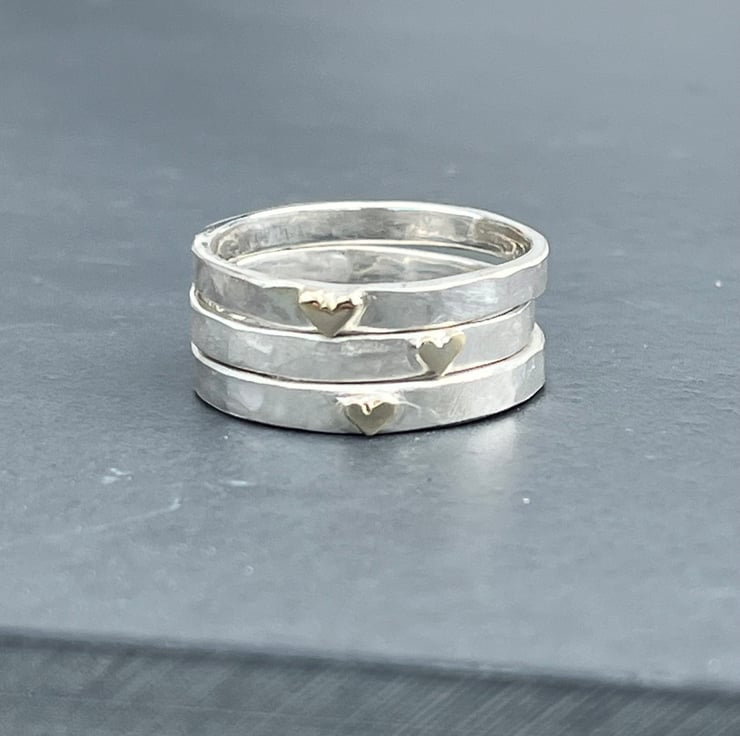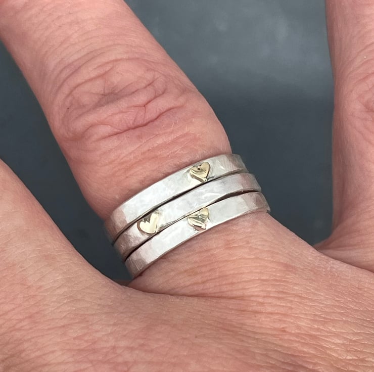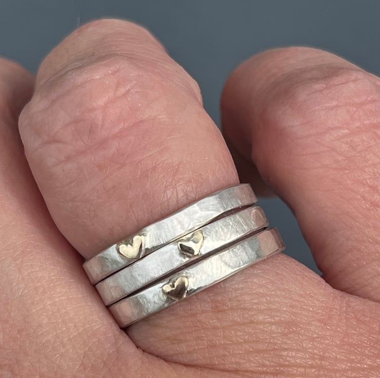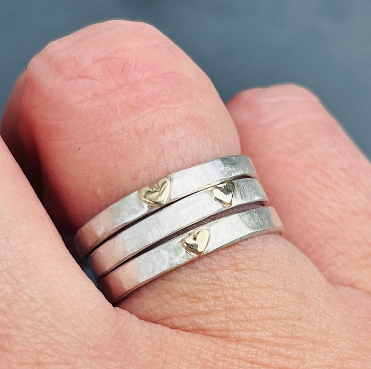 This Gold Heart Stack Ring has been handcrafted by Michelle using Sterling Silver and solid 9ct yellow gold. Each ring has been hammered, given a satin finish and features a solid 9ct yellow gold heart. The whole ring measures approximately: 8mm in width. If you would like the silver shiny please let Michelle know at Checkout. Michelle can make this ring in any size so please let her know the size you require at Checkout.