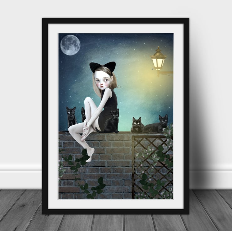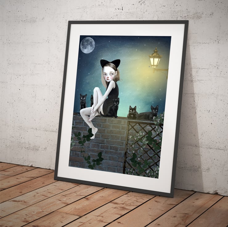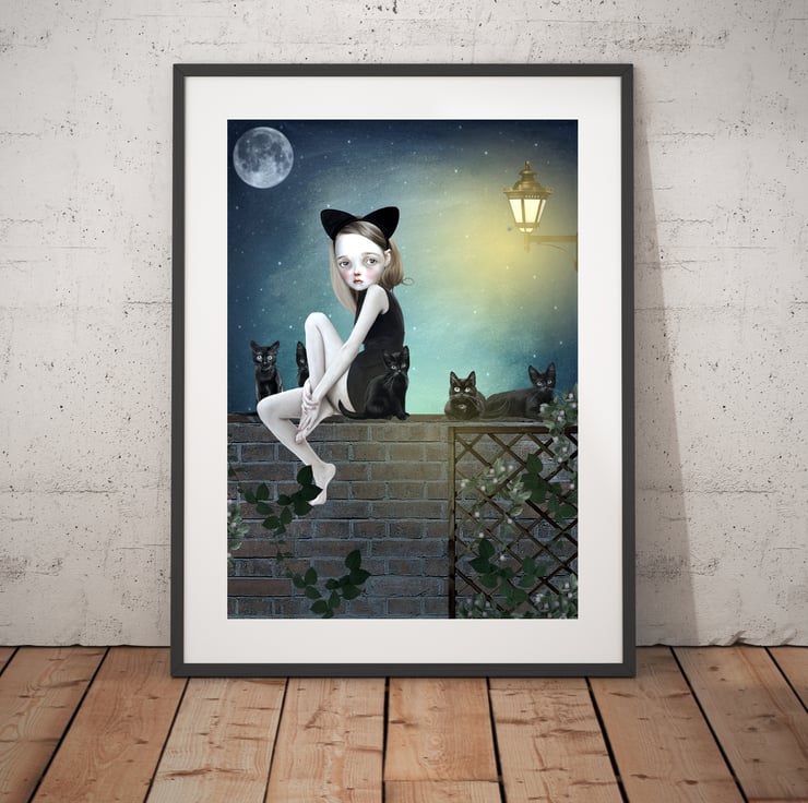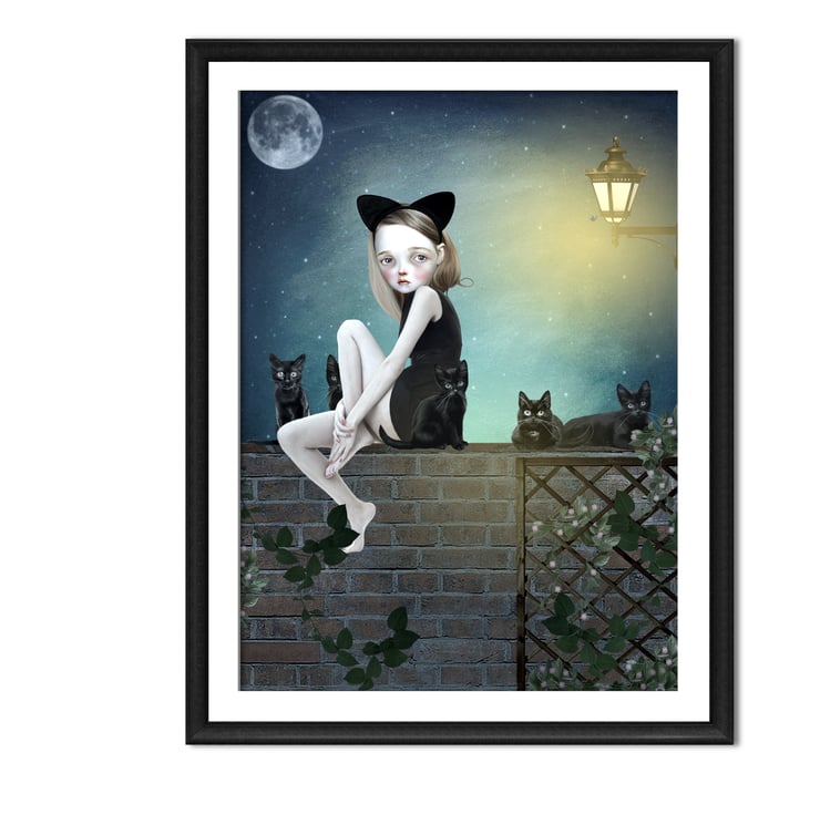 Enjoy pop surrealism with my Black Cat Wall Art Print, a mesmerizing blend of whimsy and mystery. Featuring a beguiling girl adorned with cat ears and tail, basking in the moonlight alongside a gathering of sleek black cats.