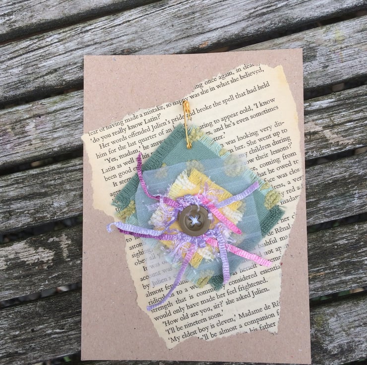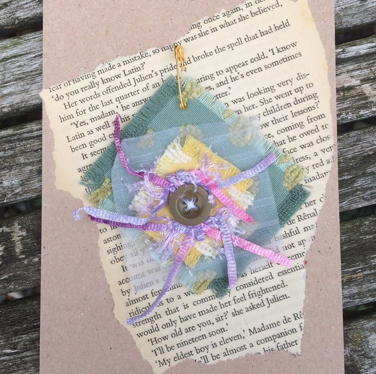 The layers are held in place with a utility style vintage 4 hole button. The snippet is presented on Kraft card decorated with a torn vintage book page and held in place with a little gold coloured safety pin.