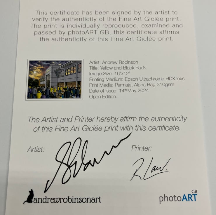 Titled ‘Yellow & Black Pack’ this is a unique Burton print direct from myself the artist. My artworks are a celebration of the match day experience and of stadium architecture.