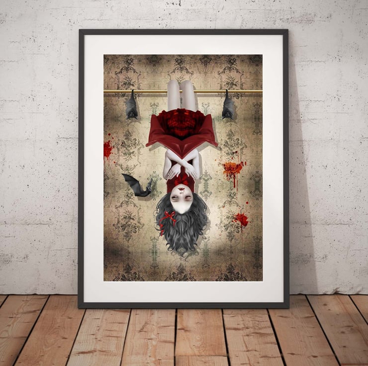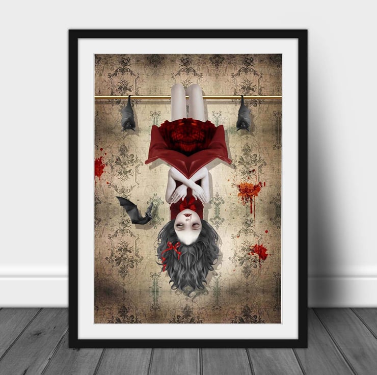 Enhance your gothic home decor with this mesmerizing Vampire and Bats art print. Featuring a serene vampire girl asleep in the rafters, surrounded by her loyal bats, this piece adds an enchanting and mysterious touch to any space. Perfect for those who appreciate dark, whimsical art, it invites viewers into a world of nocturnal beauty and fantasy.