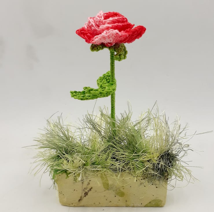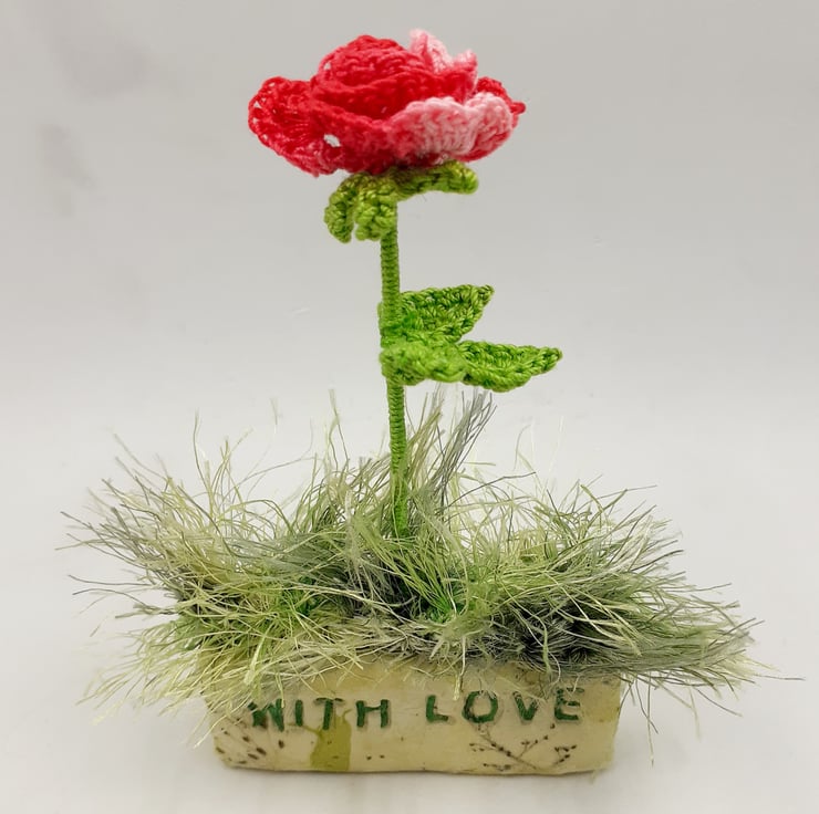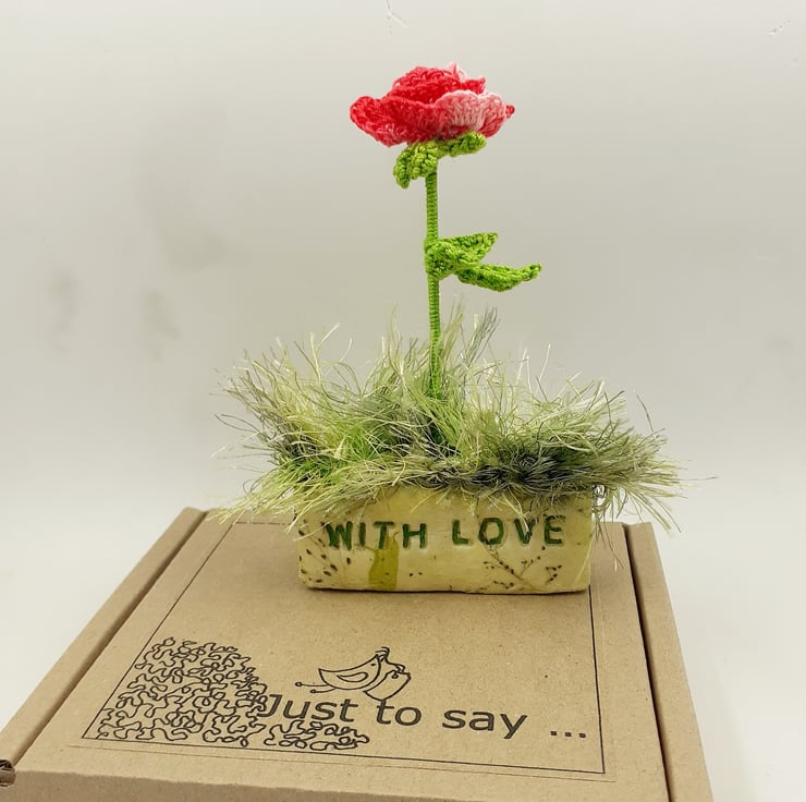 This little ornament would make a lovely alternative to a greetings card this year and a pretty keepsake for many years to come. The base is made in air dry clay which has been covered in a tissue paper containing tamarind leaves and seeds. The rose is crocheted in a variegated fine cotton and has a floristry wire stem that has been wound in cotton. It grows out of grass crocheted from eyelash yarn. The words With Love have been stamped into the clay and highlighted in permanent ink. The decoration measures approximately 11.5 cm tall by 6 cm wide and it comes in a labelled PIP (Postage in Proportion) box all ready to be given or posted on.