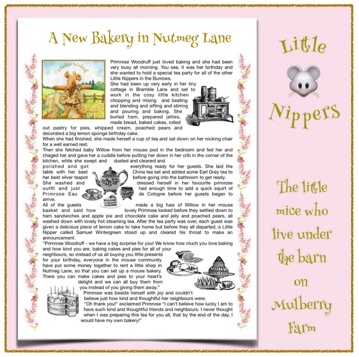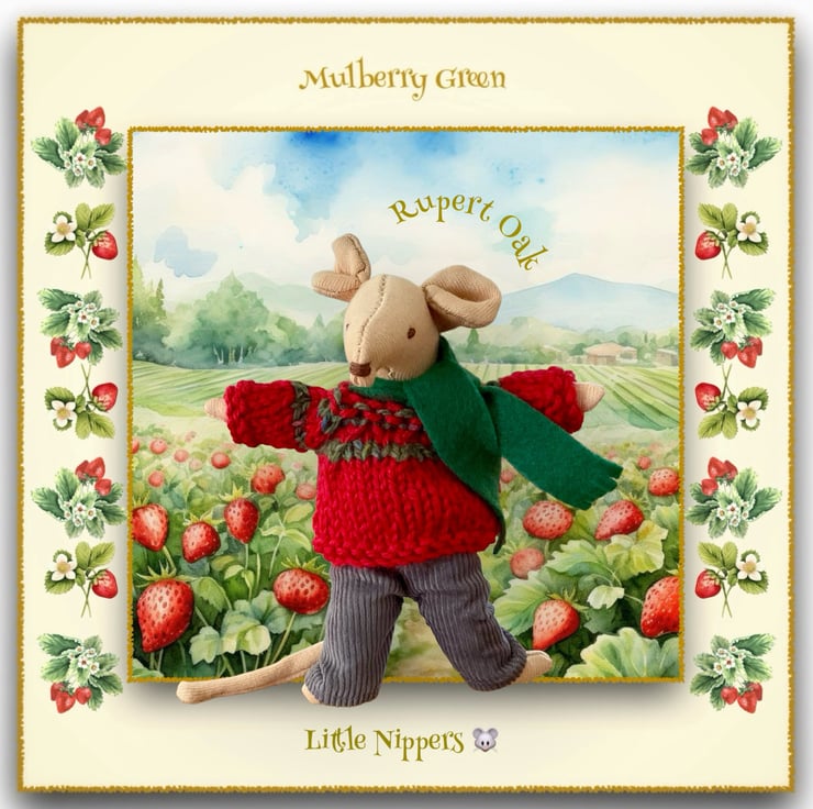 Rupert Oak, in his tiny grey cords and red striped jumper and matching scarf, is one of the Little Nippers - tiny mice who live in a maze of tunnels underneath the barn at Mulberry Farm. All of the Little Nippers are named after herbs or meadow flowers. The little mouse clothes are all removable and other clothes can be purchased - all of the clothes in the Little Nippers section of my shop are made specially to fit my mice.