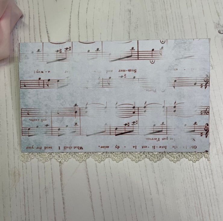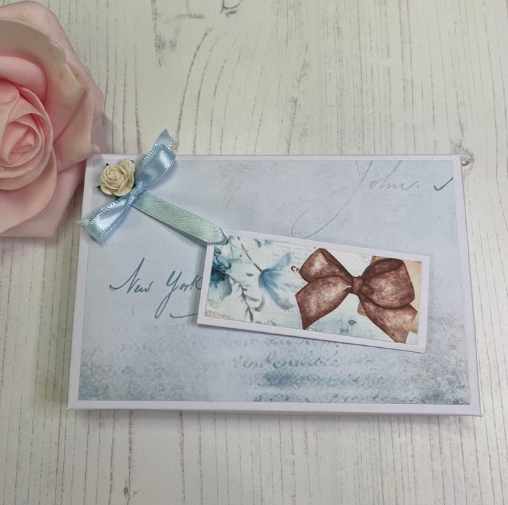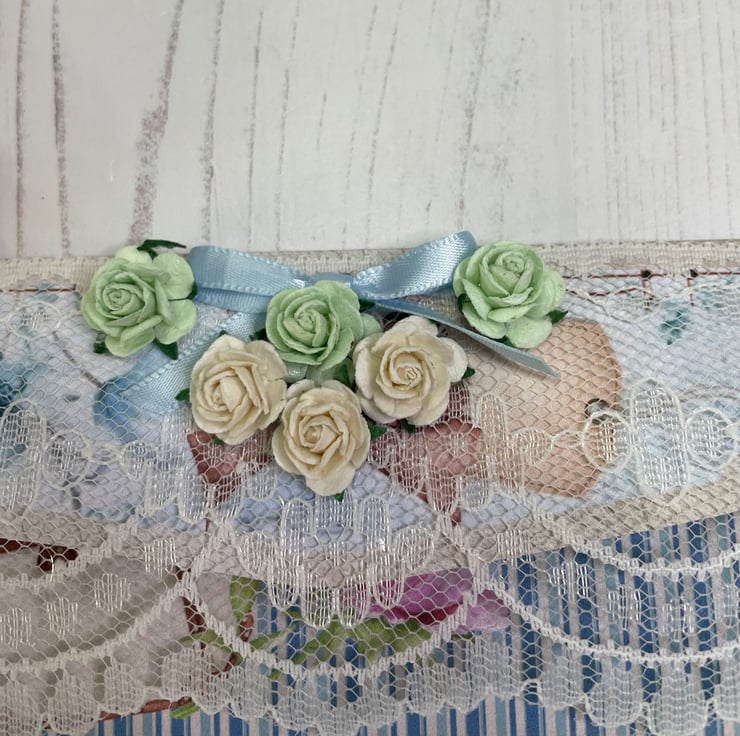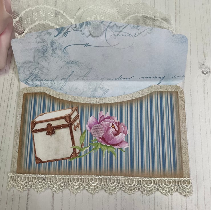 Cash is an awkward but easy gift to give. Something that needs a special envelope for presentation. Decorated with lace and paper roses. A pretty way to gift cash. Measures Box 5.5/8” x 3.75” x 3/4”. Envelope 5.25” x 3.25”.