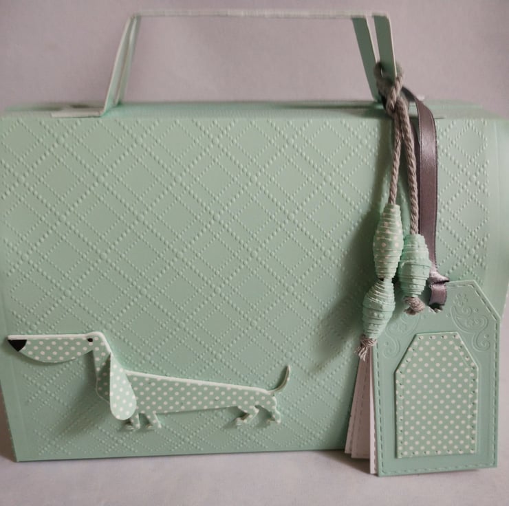 This gift bag box is made with premium quality patterned or embossed cardstock and toning finish cardstock to the sides. It opens at the top. 'Milo' the dog is cut from the brown cardstock and raised on foam to give dimension. Two paper toggles tied with thick matching twine add to the detail and the gift box comes complete with matching tags, tied with co-ordinating ribbon for you to write your message.